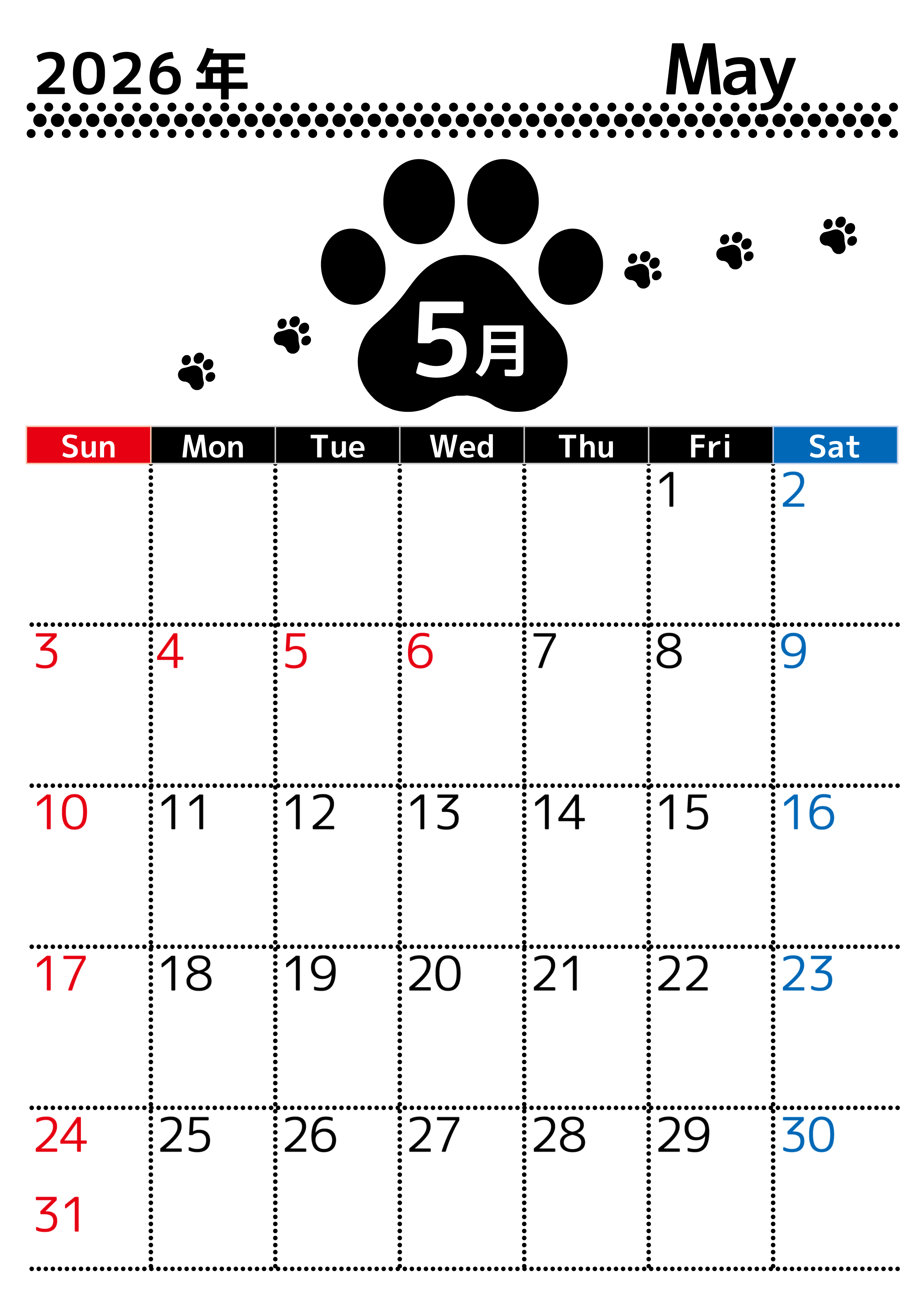 2026年5月カレンダーは縦型日曜始まりでかわいい猫の黒い足跡をテーマにしたイラスト付き♪気ままに無料ダウンロード♪(2026-01290510)