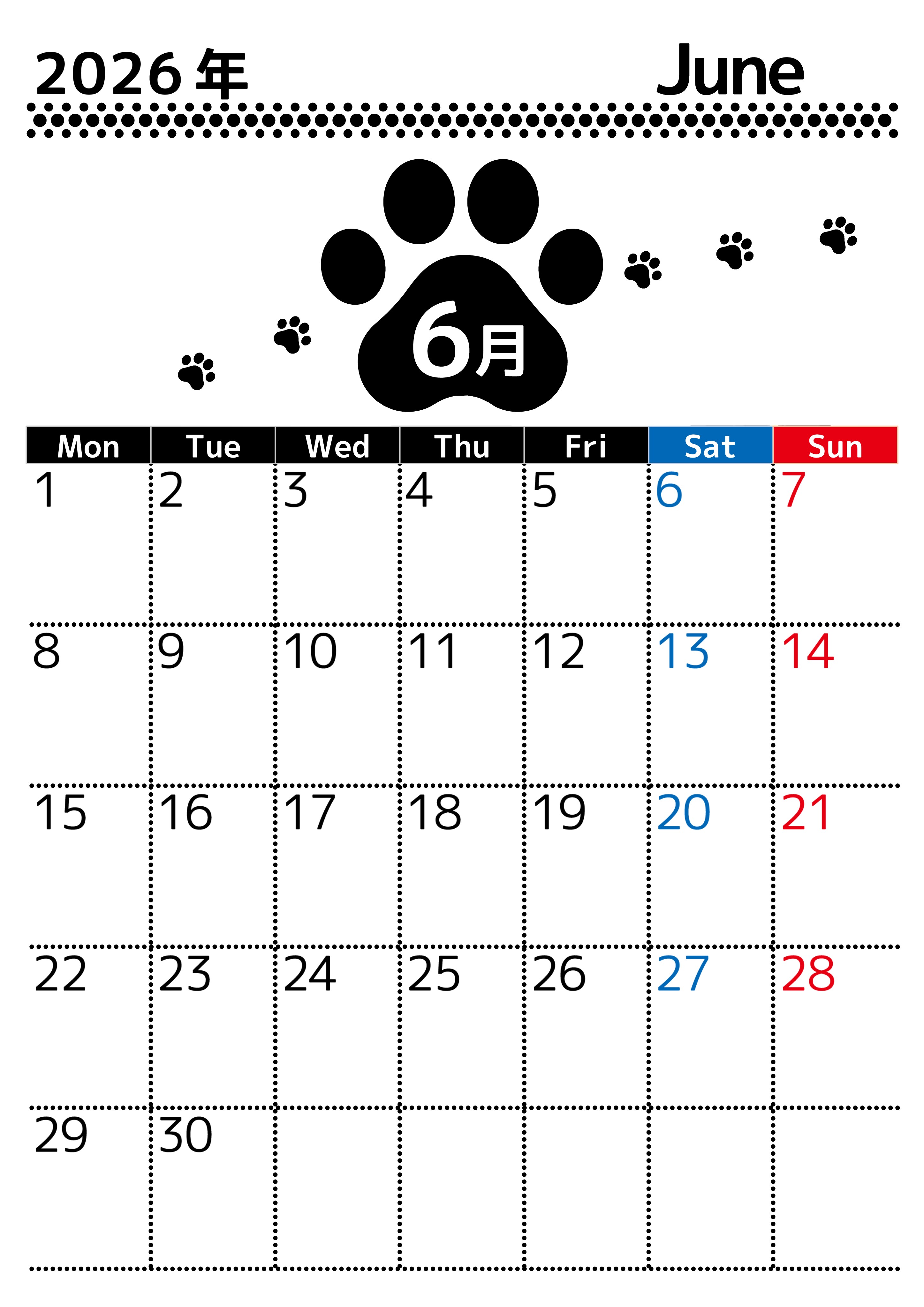 2026年・無料のカレンダーテンプレート 2026年6月カレンダーは縦型月曜始まりでかわいい猫の黒い足跡をテーマにしたイラスト付き♪気ままに無料ダウンロード♪(2026-01290611) 素材状デザイン王 2025年4月9日 2026年6月カレンダーは縦型月曜始まりでかわいい猫の黒い足跡をテーマにしたイラスト付きです。気ままに無料ダウンロードできます。(2026-01290611) かわいい 6月 猫 縦型のカレンダー 月曜始まり カレンダーデザイン-0129