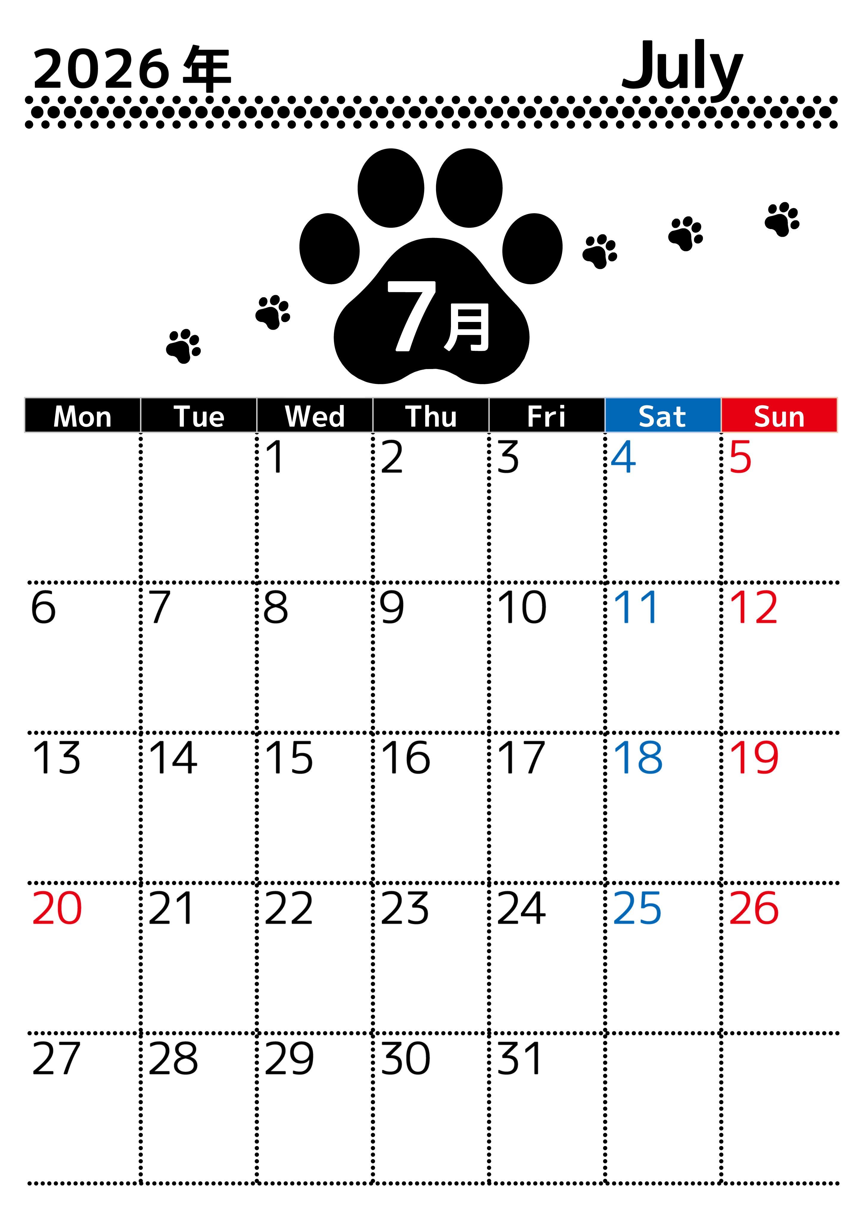 2026年・無料のカレンダーテンプレート 2026年7月カレンダーは縦型月曜始まり でかわいい猫の自由きままな足あとがおしゃれかわいいデザインなのでおすすめ:無料(2026-01290711) 素材状デザイン王 2025年4月9日 2026年7月カレンダーは縦型月曜始まりでかわいい猫の黒い足跡をテーマにしたイラスト付きです。気ままに無料ダウンロードできます。(2026-01290711) かわいい 7月 猫 縦型のカレンダー 月曜始まり カレンダーデザイン-0129