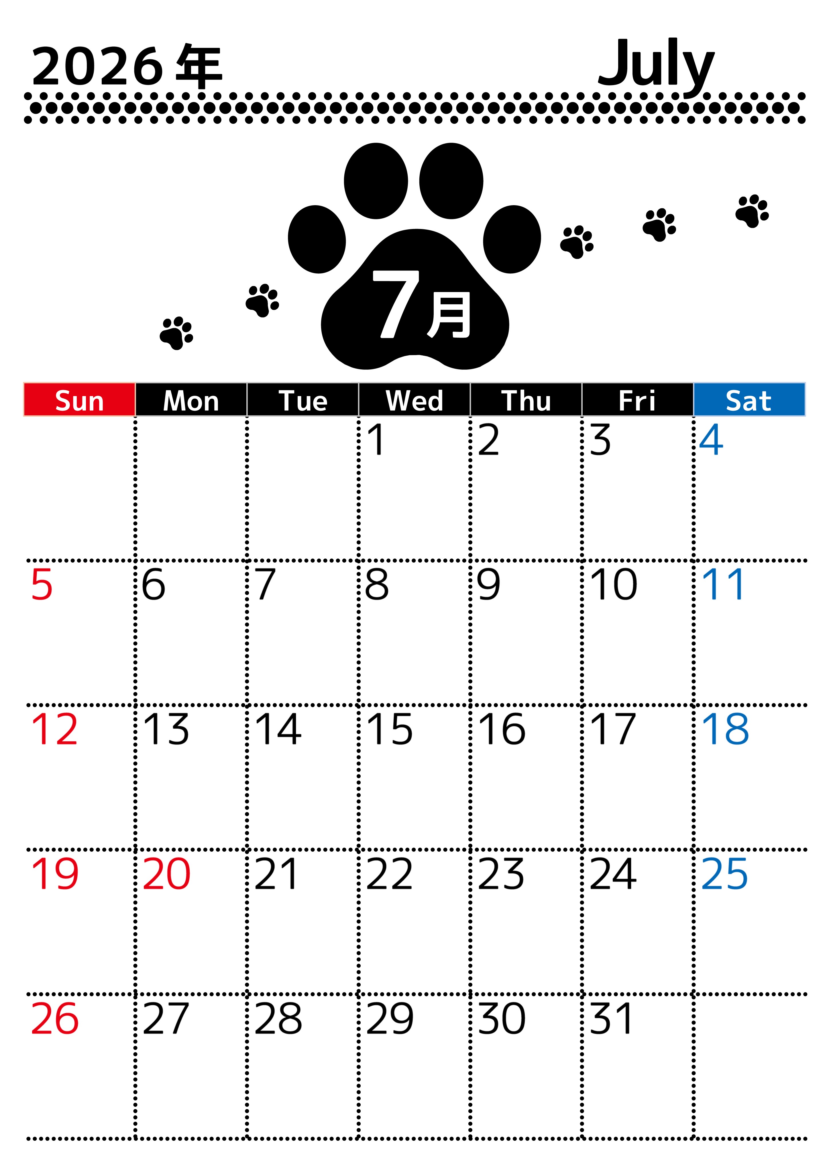 2026年・無料のカレンダーテンプレート 2026年7月カレンダーは縦型日曜始まり でかわいい猫の自由きままな足あとがおしゃれかわいいデザインなのでおすすめ:無料(2026-01290710) 素材状デザイン王 2025年4月9日 2026年7月カレンダーは縦型日曜始まりでかわいい猫の黒い足跡をテーマにしたイラスト付きです。気ままに無料ダウンロードできます。(2026-01290710) かわいい 7月 猫 縦型のカレンダー 日曜始まり カレンダーデザイン-0129