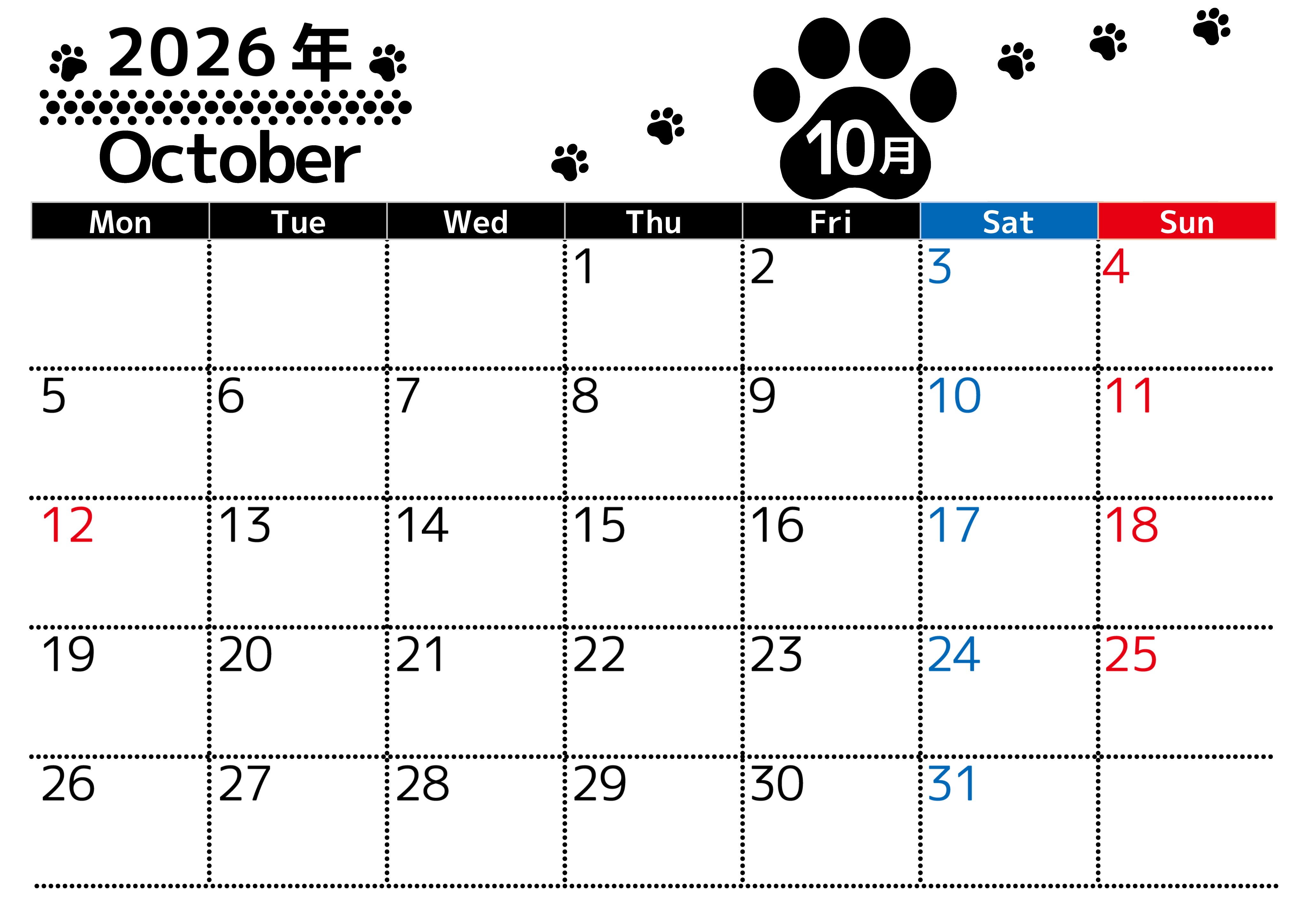 2026年・無料のカレンダーテンプレート 2026年10月カレンダーは横型月曜始まりでかわいい猫の黒い足跡をテーマにしたイラスト付き♪気ままに無料ダウンロード♪(2026-01291001) 素材状デザイン王 2025年4月9日 2026年10月カレンダーは横型月曜始まりでかわいい猫の黒い足跡をテーマにしたイラスト付きです。気ままに無料ダウンロードできます。(2026-01291001) かわいい 10月 猫 横型のカレンダー 月曜始まり カレンダーデザイン-0129