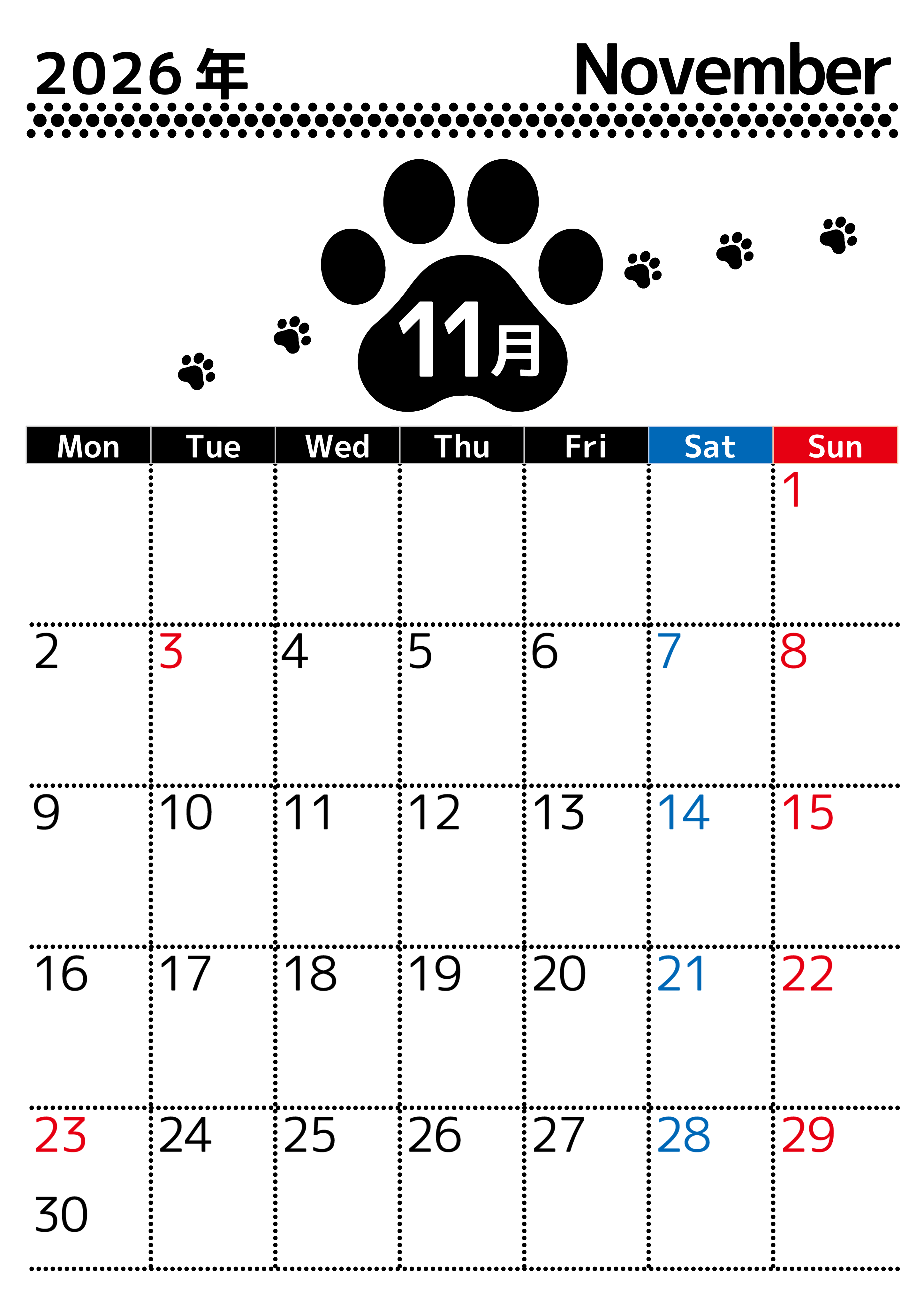 2026年・無料のカレンダーテンプレート 2026年11月カレンダーは縦型月曜始まりでかわいい猫の黒い足跡をテーマにしたイラスト付き♪気ままに無料ダウンロード♪(2026-01291111) 素材状デザイン王 2025年4月9日 2026年11月カレンダーは縦型月曜始まりでかわいい猫の黒い足跡をテーマにしたイラスト付きです。気ままに無料ダウンロードできます。(2026-01291111) かわいい 11月 猫 縦型のカレンダー 月曜始まり カレンダーデザイン-0129