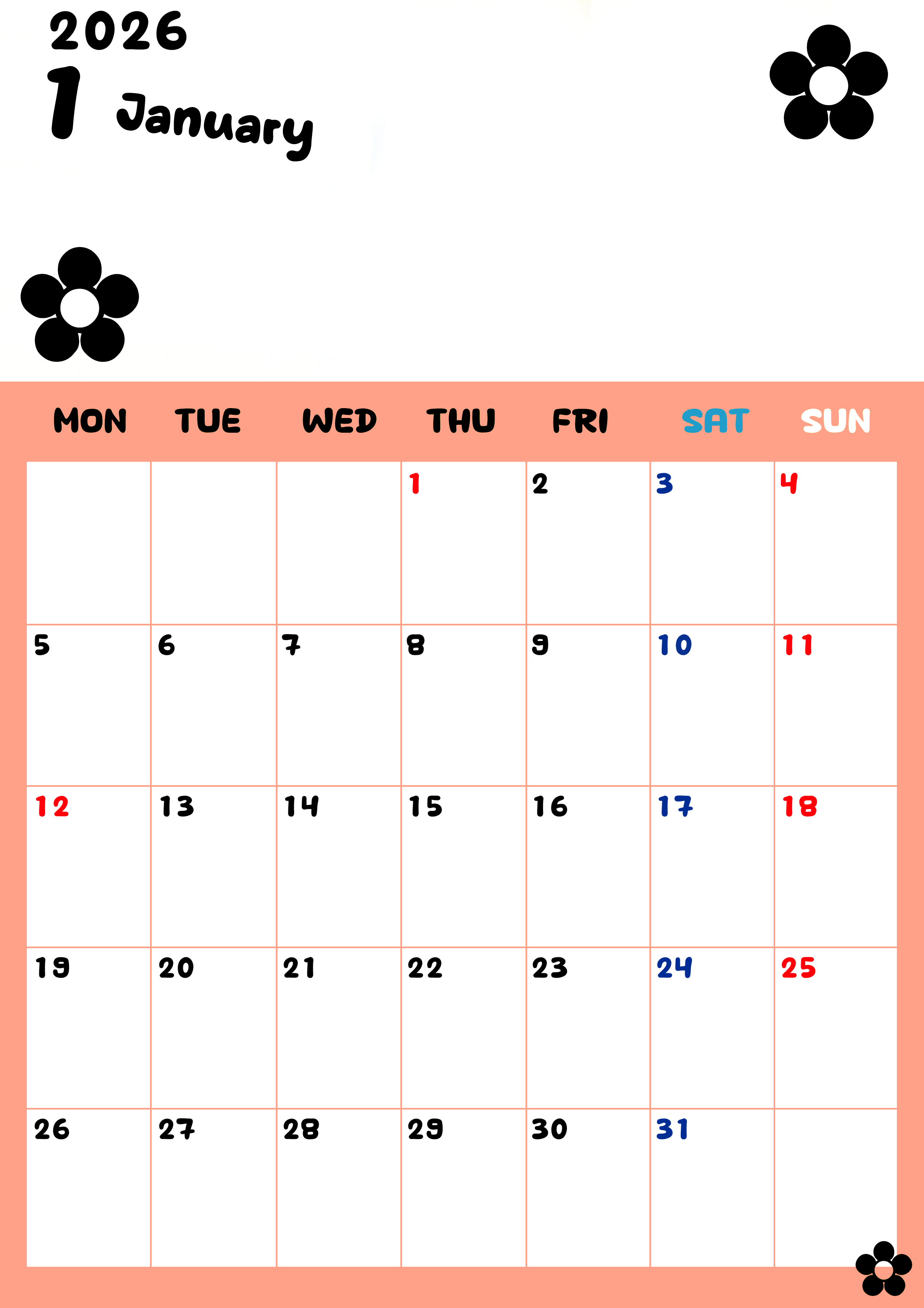 2026年・無料のカレンダーテンプレート 2026年1月カレンダーは縦型月曜始まりでフラワーシルエットがかわいいシンプルお花デザイン:無料(2026-01300111) 素材状デザイン王 2025年4月10日 2026年1月カレンダーは縦型月曜始まりでフラワーシルエットがかわいいシンプルなお花デザインです。暮らしを豊かにする予定の整理におすすめの無料ダウンロード可能コンテンツです。(2026-01300111) かわいい 1月 草花 縦型のカレンダー 月曜始まり カレンダーデザイン-0130