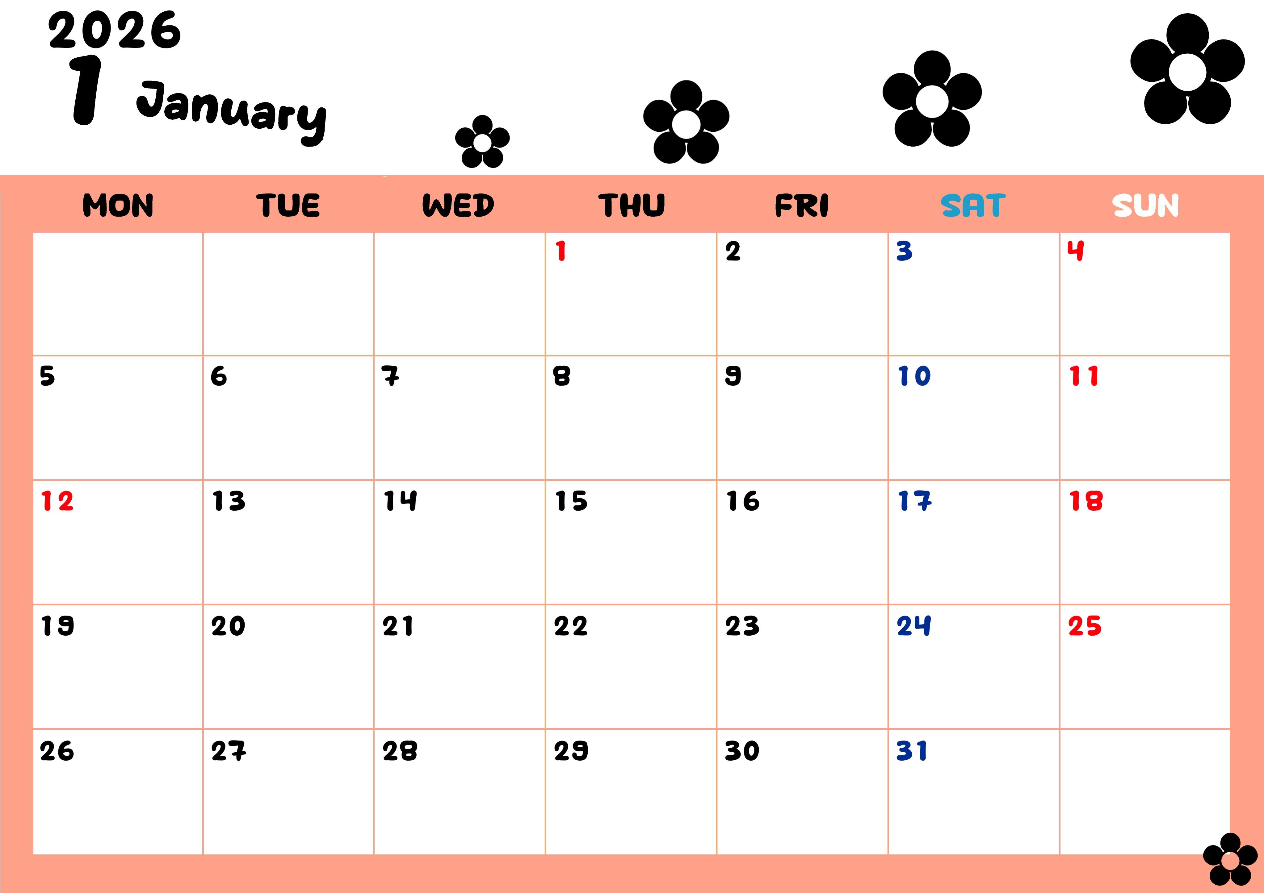 2026年1月カレンダーは横型月曜始まりでフラワーシルエットがかわいいシンプルお花デザイン:無料(2026-01300101)
