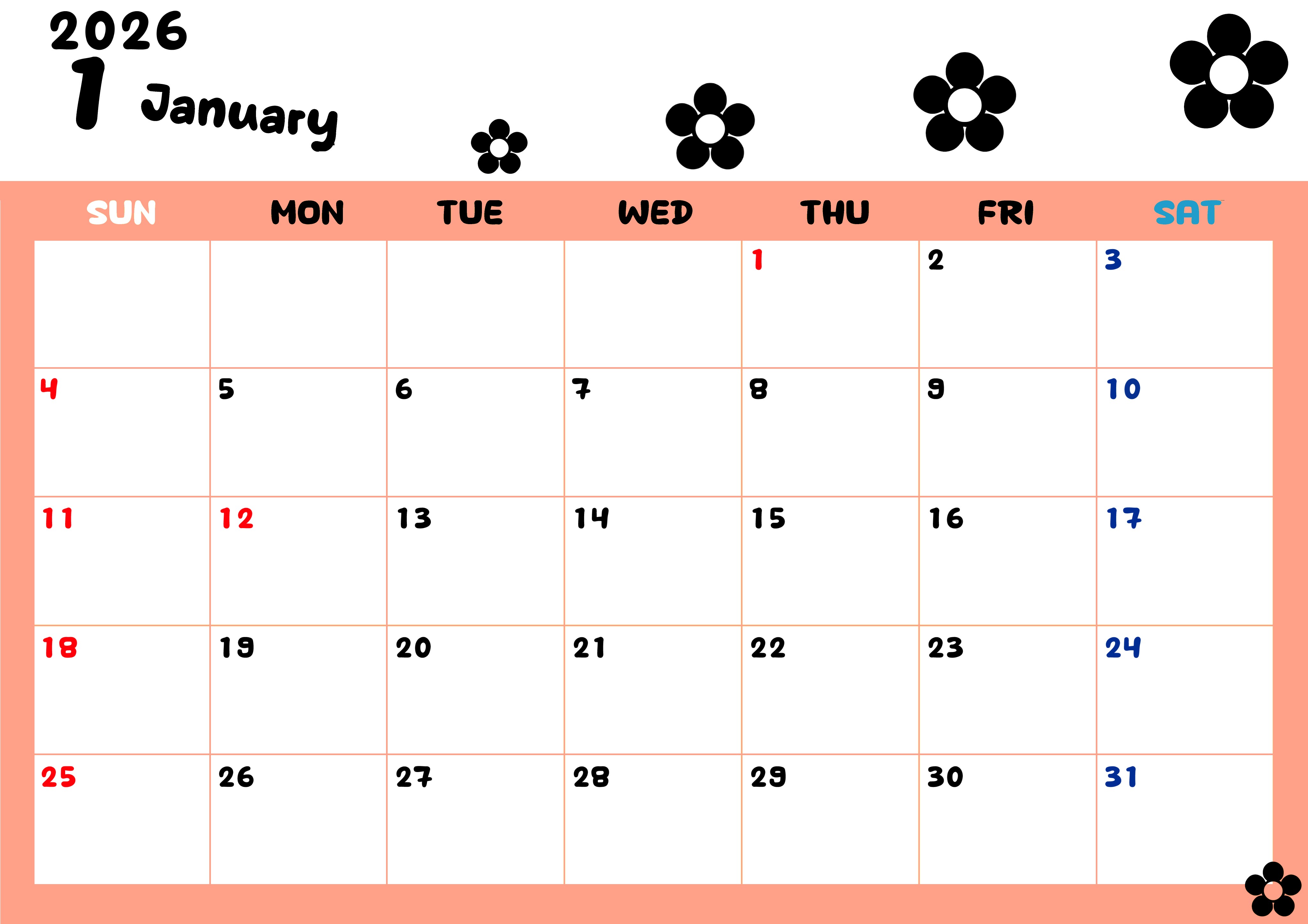 2026年・無料のカレンダーテンプレート 2026年1月カレンダーは横型日曜始まりでフラワーシルエットがかわいいシンプルお花デザイン:無料(2026-01300100) 素材状デザイン王 2025年4月10日 2026年1月カレンダーは横型日曜始まりでフラワーシルエットがかわいいシンプルなお花デザインです。暮らしを豊かにする予定の整理におすすめの無料ダウンロード可能コンテンツです。(2026-01300100) かわいい 1月 草花 横型のカレンダー 日曜始まり カレンダーデザイン-0130