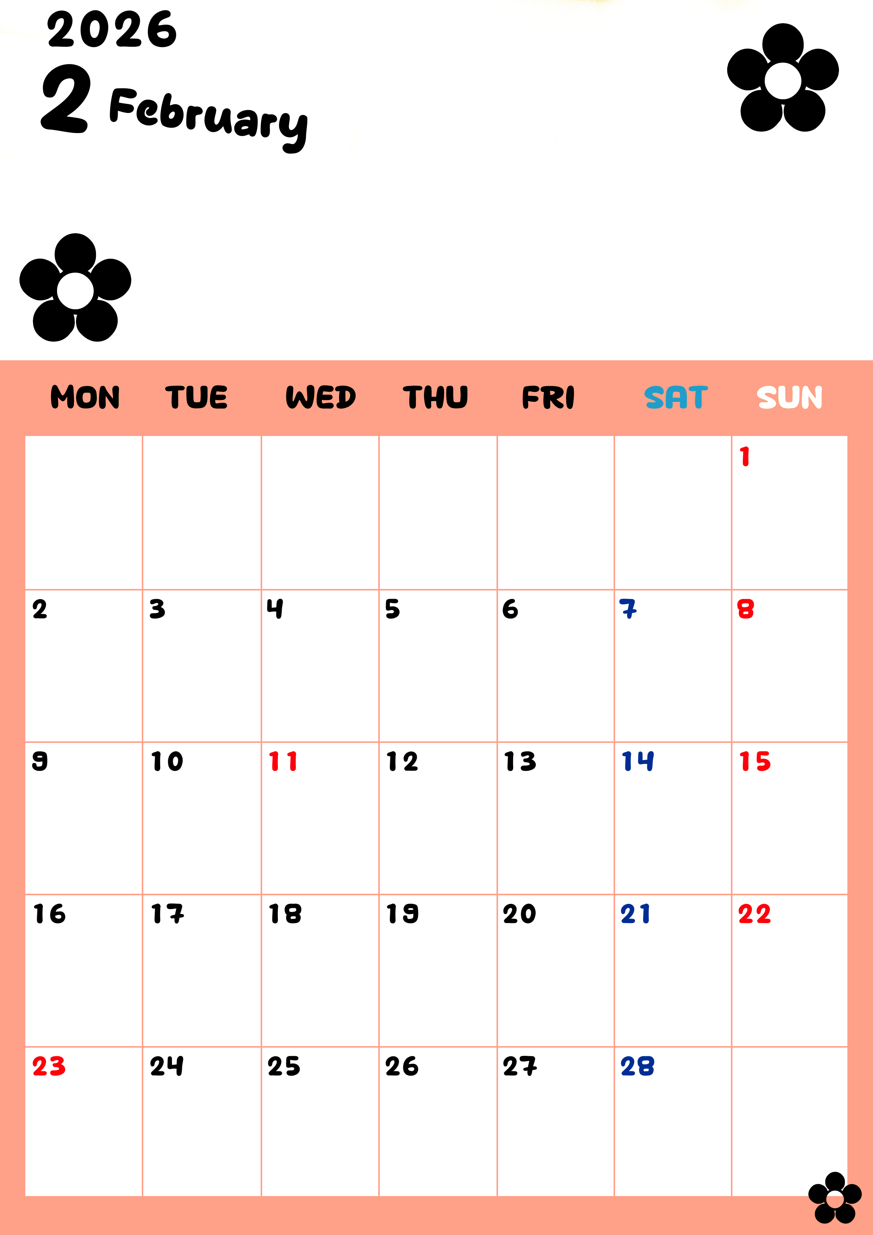 2026年・無料のカレンダーテンプレート 2026年2月カレンダーは縦型月曜始まりでフラワーシルエットがかわいいシンプルお花デザイン:無料(2026-01300211) 素材状デザイン王 2025年4月10日 2026年2月カレンダーは縦型月曜始まりでフラワーシルエットがかわいいシンプルなお花デザインです。暮らしを豊かにする予定の整理におすすめの無料ダウンロード可能コンテンツです。(2026-01300211) かわいい 2月 草花 縦型のカレンダー 月曜始まり カレンダーデザイン-0130