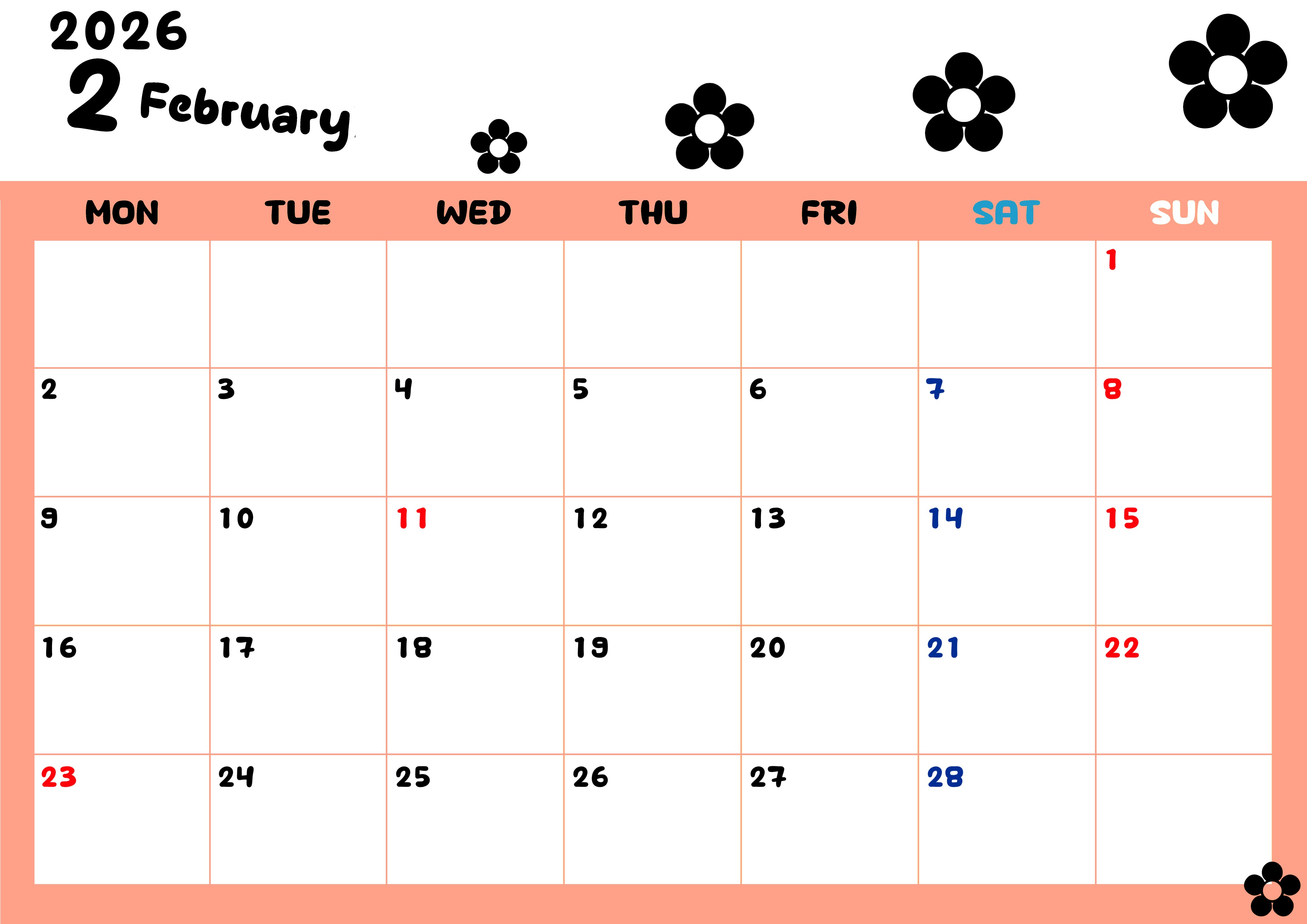2026年・無料のカレンダーテンプレート 2026年2月カレンダーは横型月曜始まりでフラワーシルエットがかわいいシンプルお花デザイン:無料(2026-01300201) 素材状デザイン王 2025年4月10日 2026年2月カレンダーは横型月曜始まりでフラワーシルエットがかわいいシンプルなお花デザインです。暮らしを豊かにする予定の整理におすすめの無料ダウンロード可能コンテンツです。(2026-01300201) かわいい 2月 草花 横型のカレンダー 月曜始まり カレンダーデザイン-0130