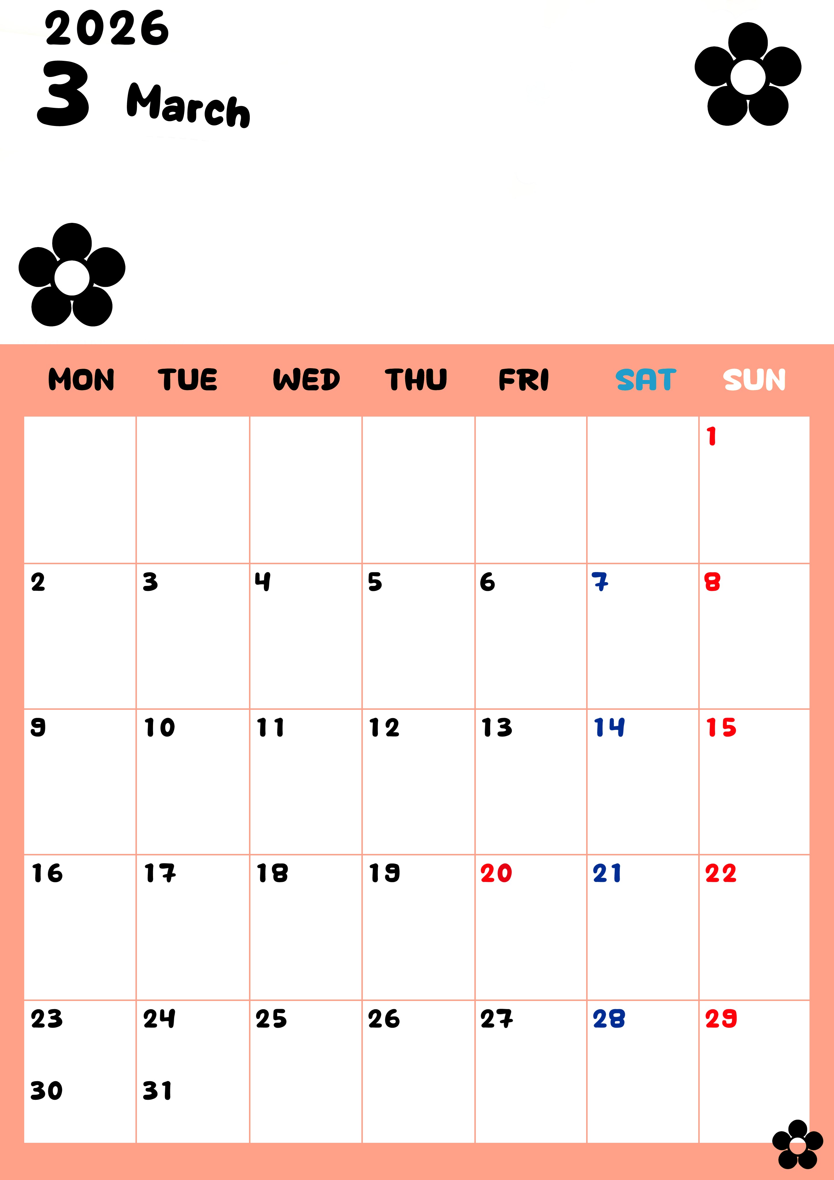2026年・無料のカレンダーテンプレート 2026年3月カレンダーは縦型月曜始まりでフラワーシルエットがかわいいシンプルお花デザイン:無料(2026-01300311) 素材状デザイン王 2025年4月10日 2026年3月カレンダーは縦型月曜始まりでフラワーシルエットがかわいいシンプルなお花デザインです。暮らしを豊かにする予定の整理におすすめの無料ダウンロード可能コンテンツです。(2026-01300311) かわいい 3月 草花 縦型のカレンダー 月曜始まり カレンダーデザイン-0130