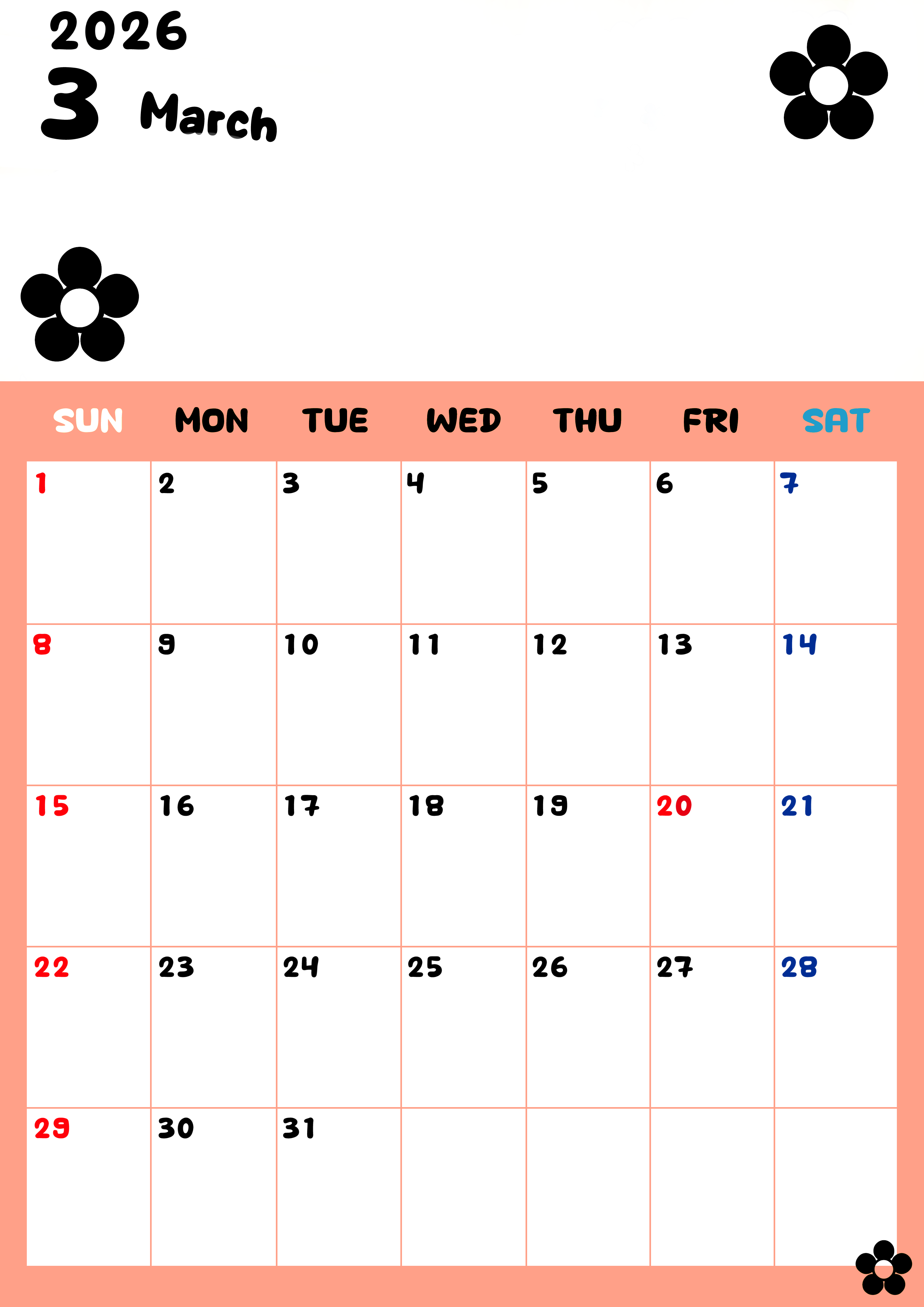 2026年3月カレンダーは縦型日曜始まりでフラワーシルエットがかわいいシンプルなお花デザインです。暮らしを豊かにする予定の整理におすすめの無料ダウンロード可能コンテンツです。(2026-01300310)