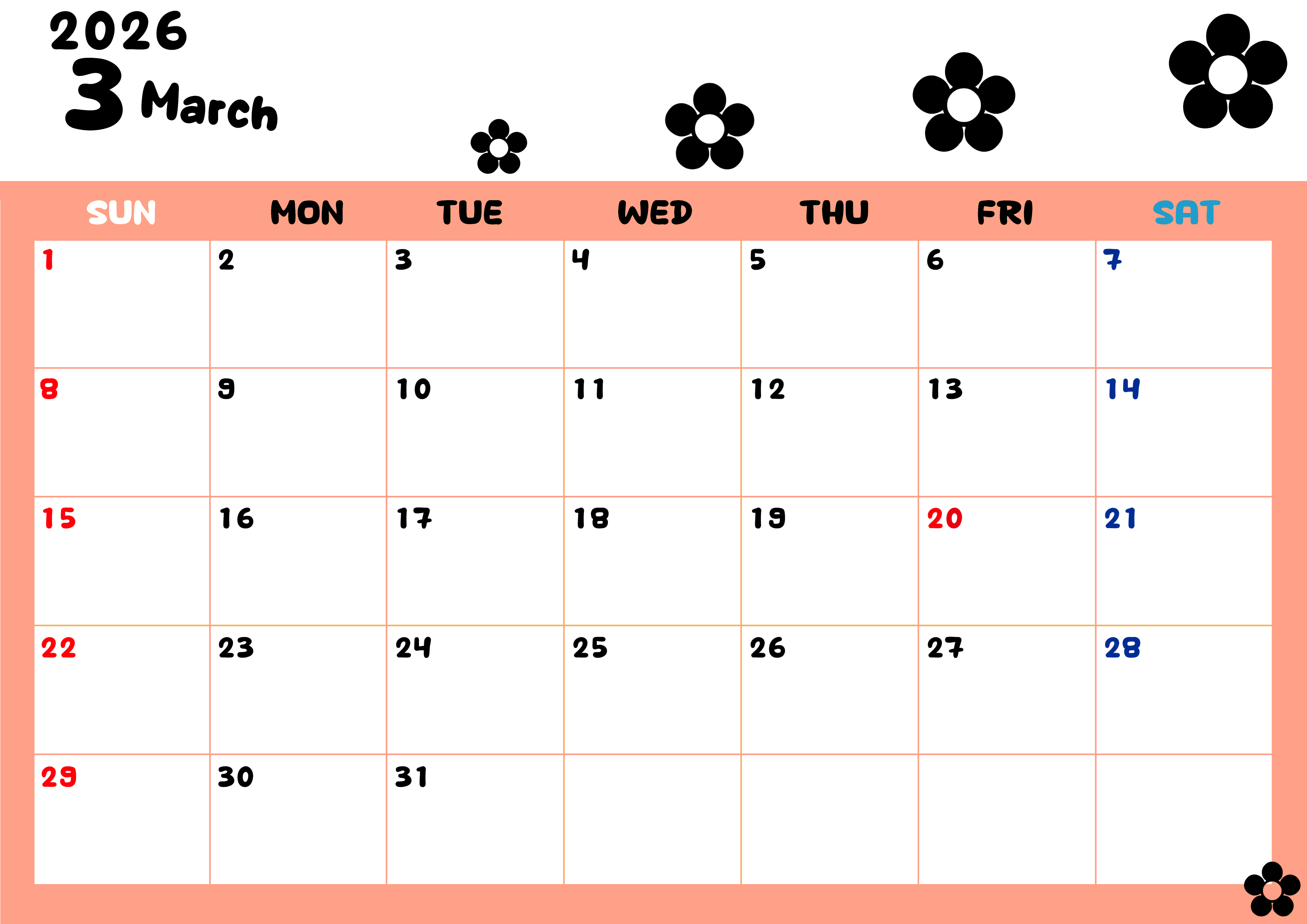 2026年・無料のカレンダーテンプレート 2026年3月カレンダーは横型日曜始まりでフラワーシルエットがかわいいシンプルお花デザイン:無料(2026-01300300) 素材状デザイン王 2025年4月10日 2026年3月カレンダーは横型日曜始まりでフラワーシルエットがかわいいシンプルなお花デザインです。暮らしを豊かにする予定の整理におすすめの無料ダウンロード可能コンテンツです。(2026-01300300) かわいい 3月 草花 横型のカレンダー 日曜始まり カレンダーデザイン-0130