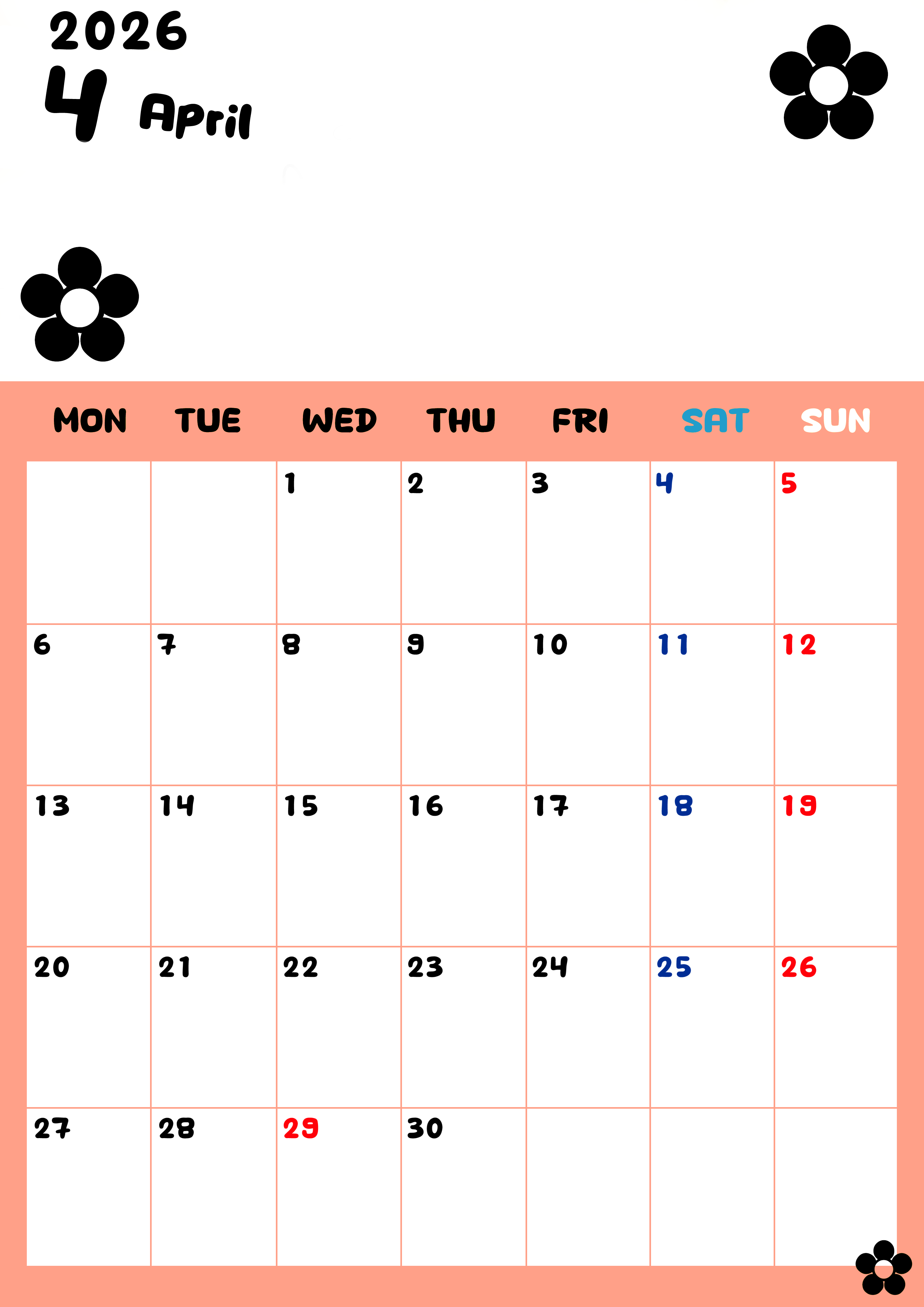 2026年・無料のカレンダーテンプレート 2026年4月カレンダーは縦型月曜始まりでフラワーシルエットがかわいいシンプルお花デザイン:無料(2026-01300411) 素材状デザイン王 2025年4月10日 2026年4月カレンダーは縦型月曜始まりでフラワーシルエットがかわいいシンプルなお花デザインです。暮らしを豊かにする予定の整理におすすめの無料ダウンロード可能コンテンツです。(2026-01300411) かわいい 4月 草花 縦型のカレンダー 月曜始まり カレンダーデザイン-0130