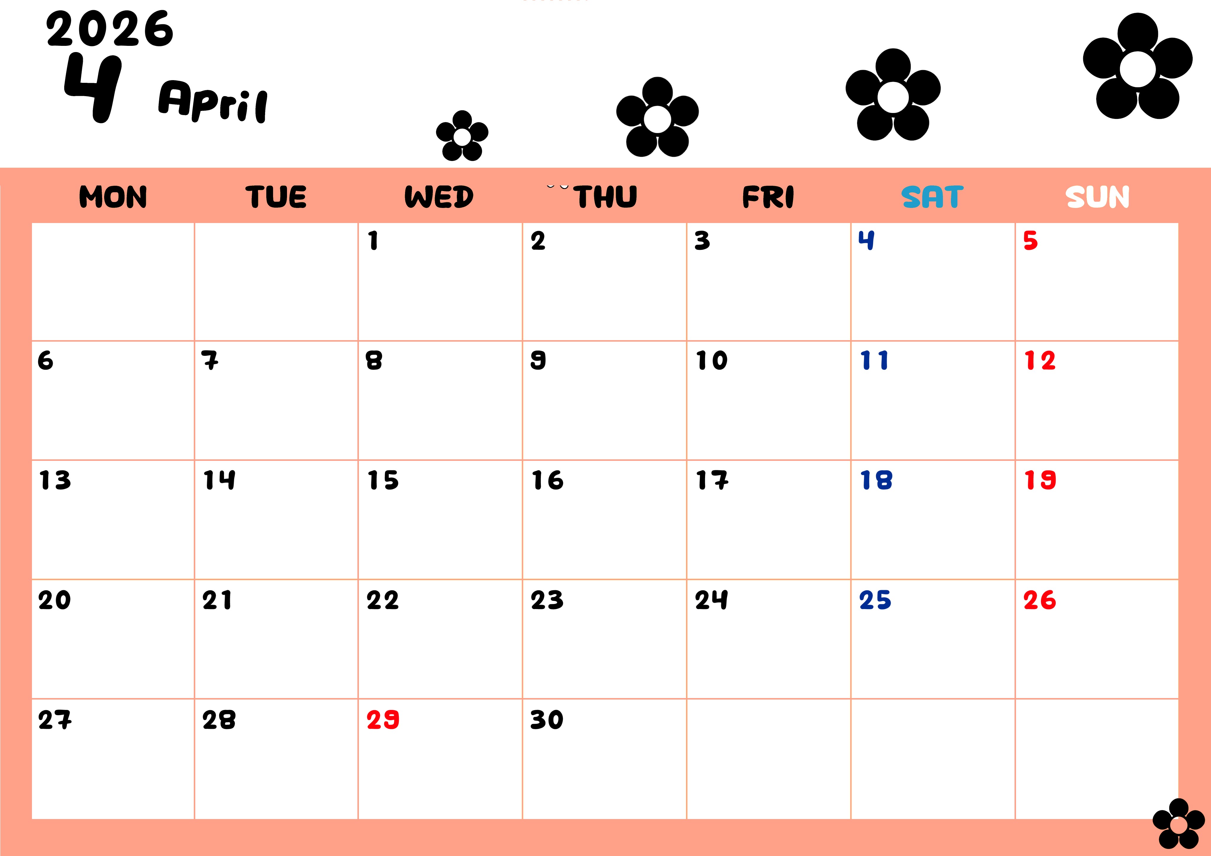 2026年・無料のカレンダーテンプレート 2026年4月カレンダーは横型月曜始まりでフラワーシルエットがかわいいシンプルお花デザイン:無料(2026-01300401) 素材状デザイン王 2025年4月10日 2026年4月カレンダーは横型月曜始まりでフラワーシルエットがかわいいシンプルなお花デザインです。暮らしを豊かにする予定の整理におすすめの無料ダウンロード可能コンテンツです。(2026-01300401) かわいい 4月 草花 横型のカレンダー 月曜始まり カレンダーデザイン-0130