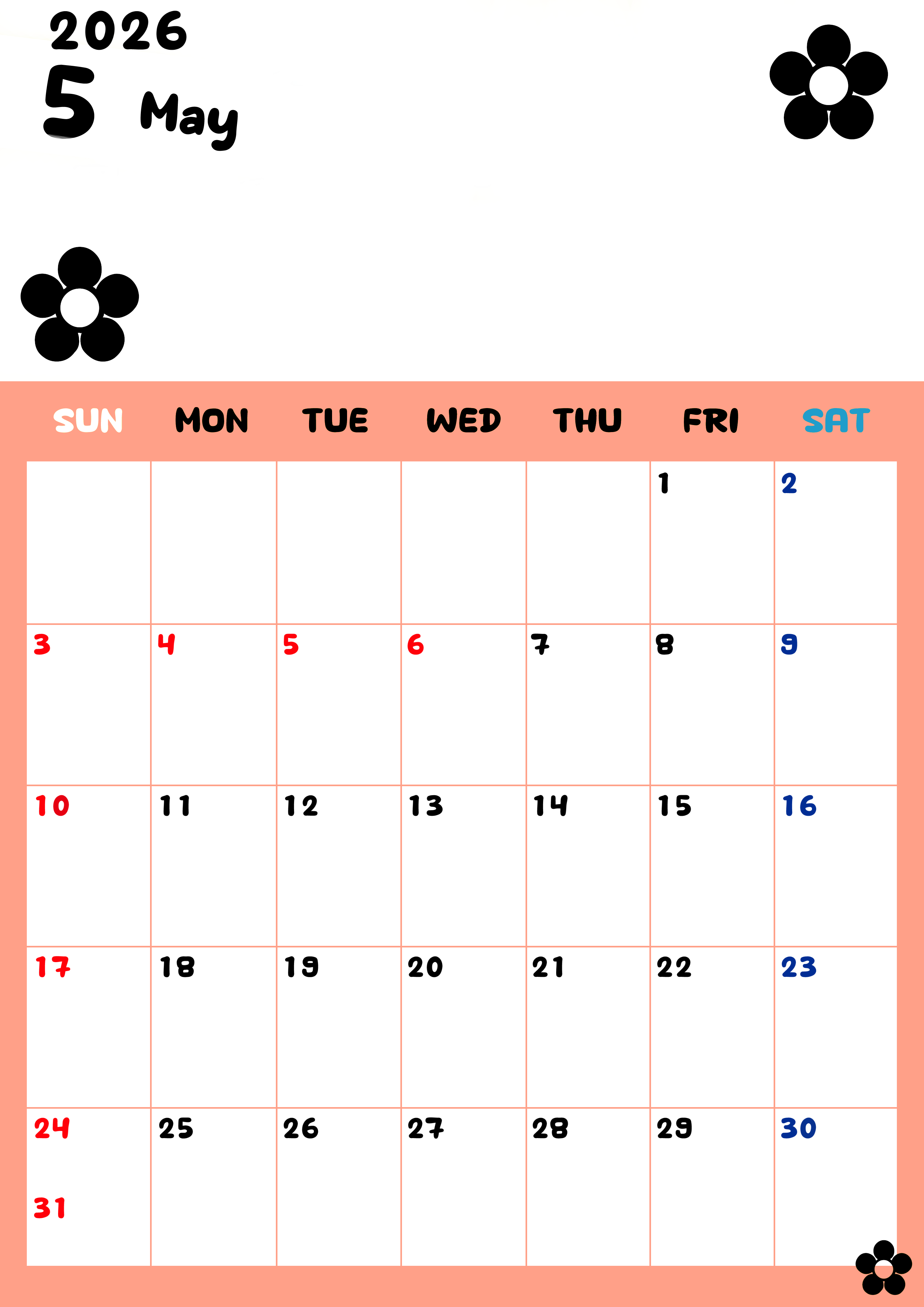 2026年・無料のカレンダーテンプレート 2026年5月カレンダーは縦型日曜始まりでフラワーシルエットがかわいいシンプルお花デザイン:無料(2026-01300510) 素材状デザイン王 2025年4月10日 2026年5月カレンダーは縦型日曜始まりでフラワーシルエットがかわいいシンプルなお花デザインです。暮らしを豊かにする予定の整理におすすめの無料ダウンロード可能コンテンツです。(2026-01300510) かわいい 5月 草花 縦型のカレンダー 日曜始まり カレンダーデザイン-0130