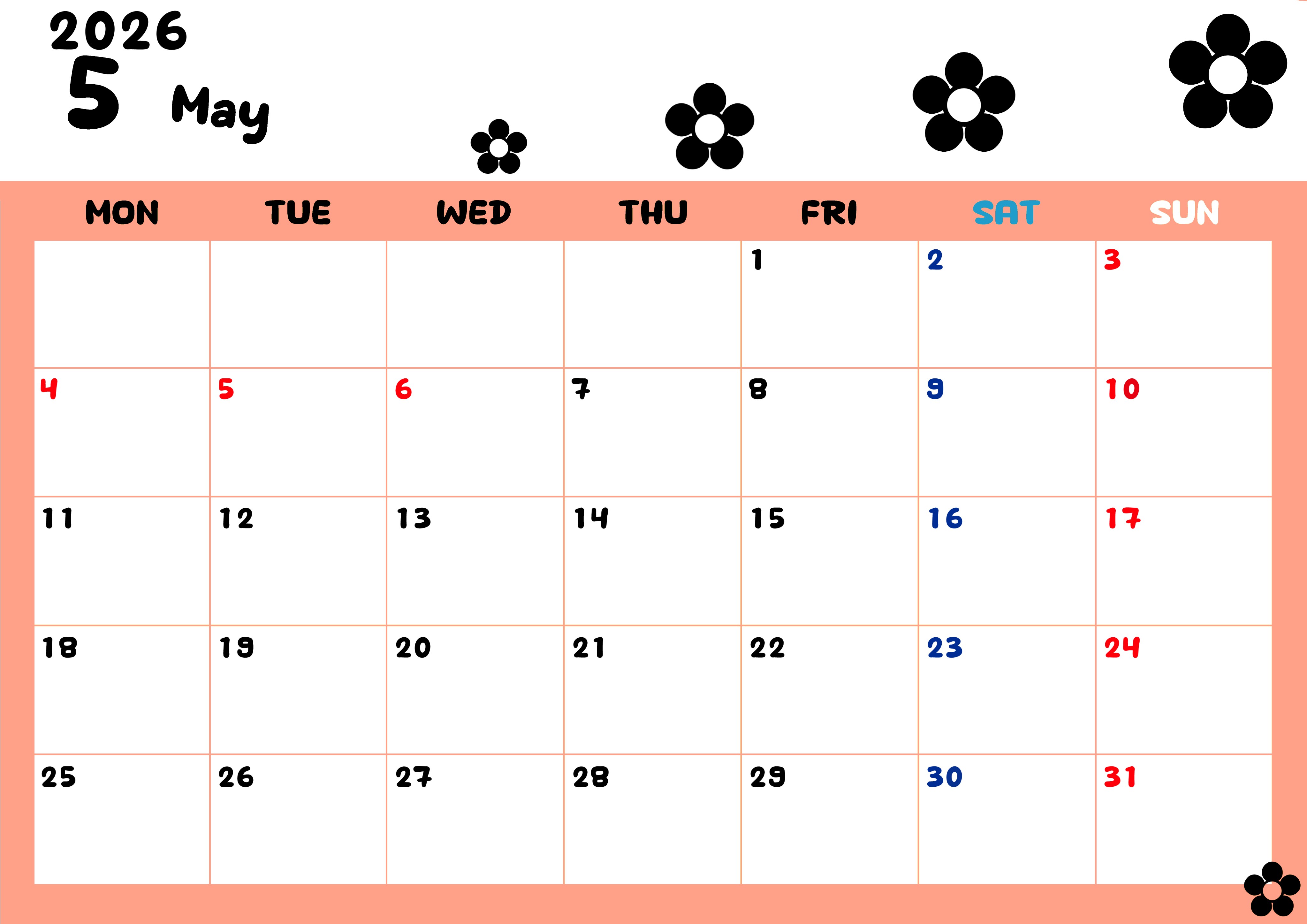 2026年・無料のカレンダーテンプレート 2026年5月カレンダーは横型月曜始まりでフラワーシルエットがかわいいシンプルお花デザイン:無料(2026-01300501) 素材状デザイン王 2025年4月10日 2026年5月カレンダーは横型月曜始まりでフラワーシルエットがかわいいシンプルなお花デザインです。暮らしを豊かにする予定の整理におすすめの無料ダウンロード可能コンテンツです。(2026-01300501) かわいい 5月 草花 横型のカレンダー 月曜始まり カレンダーデザイン-0130