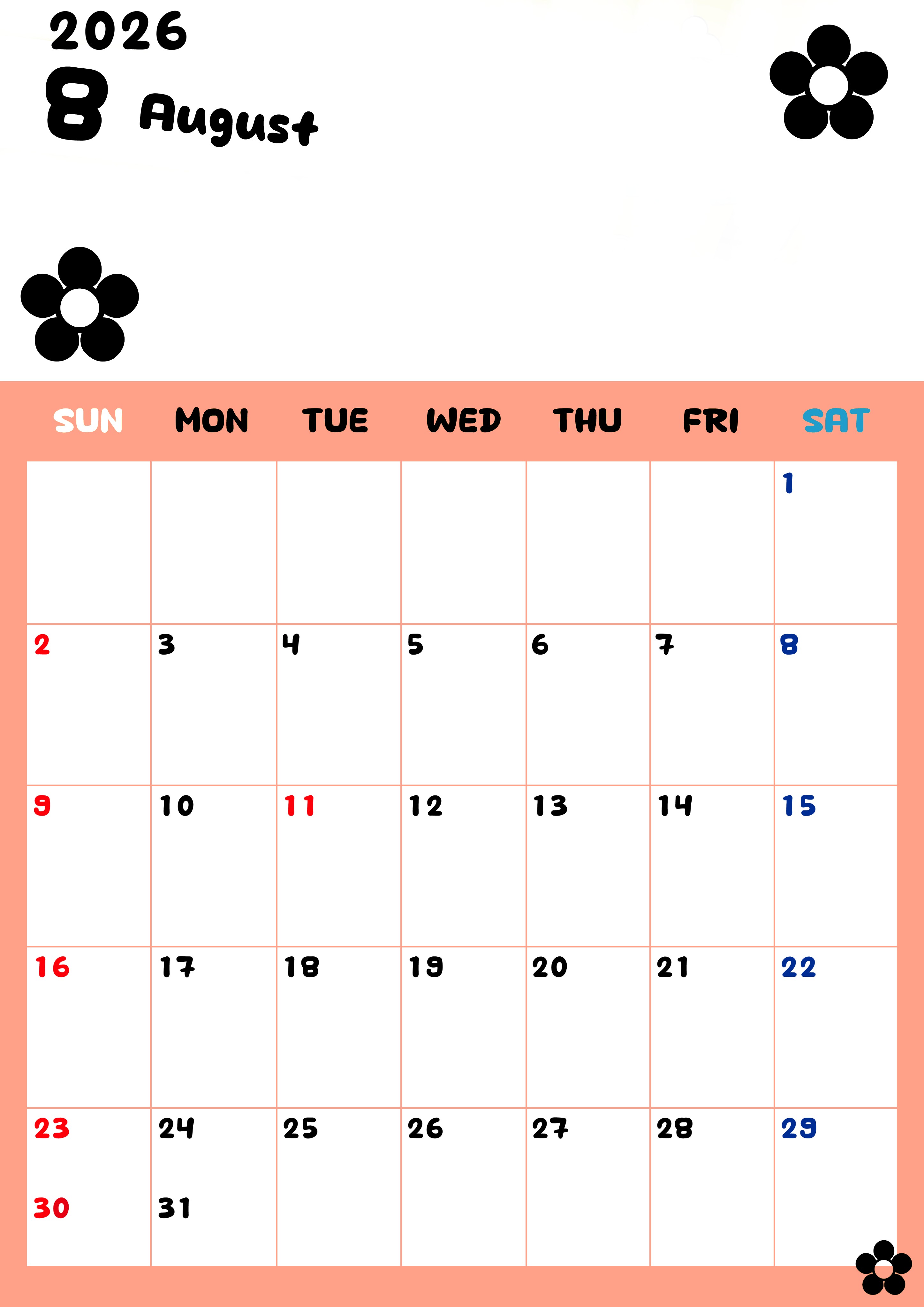 2026年・無料のカレンダーテンプレート 2026年8月カレンダーは縦型日曜始まりでフラワーシルエットがかわいいシンプルお花デザイン:無料(2026-01300810) 素材状デザイン王 2025年4月10日 2026年8月カレンダーは縦型日曜始まりでフラワーシルエットがかわいいシンプルなお花デザインです。暮らしを豊かにする予定の整理におすすめの無料ダウンロード可能コンテンツです。(2026-01300810) かわいい 8月 草花 縦型のカレンダー 日曜始まり カレンダーデザイン-0130