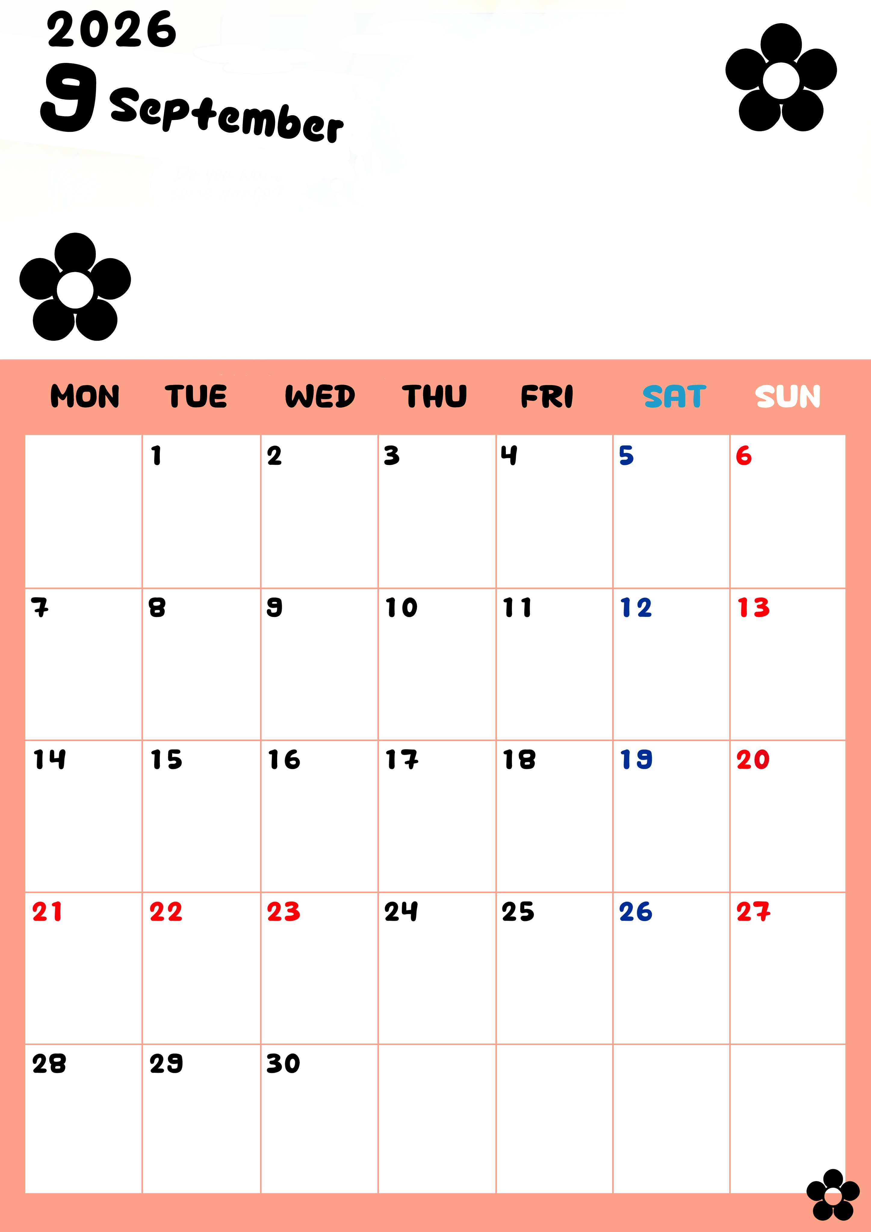 2026年・無料のカレンダーテンプレート 2026年9月カレンダーは縦型月曜始まりでフラワーシルエットがかわいいシンプルお花デザイン:無料(2026-01300911) 素材状デザイン王 2025年4月10日 2026年9月カレンダーは縦型月曜始まりでフラワーシルエットがかわいいシンプルなお花デザインです。暮らしを豊かにする予定の整理におすすめの無料ダウンロード可能コンテンツです。(2026-01300911) かわいい 9月 草花 縦型のカレンダー 月曜始まり カレンダーデザイン-0130