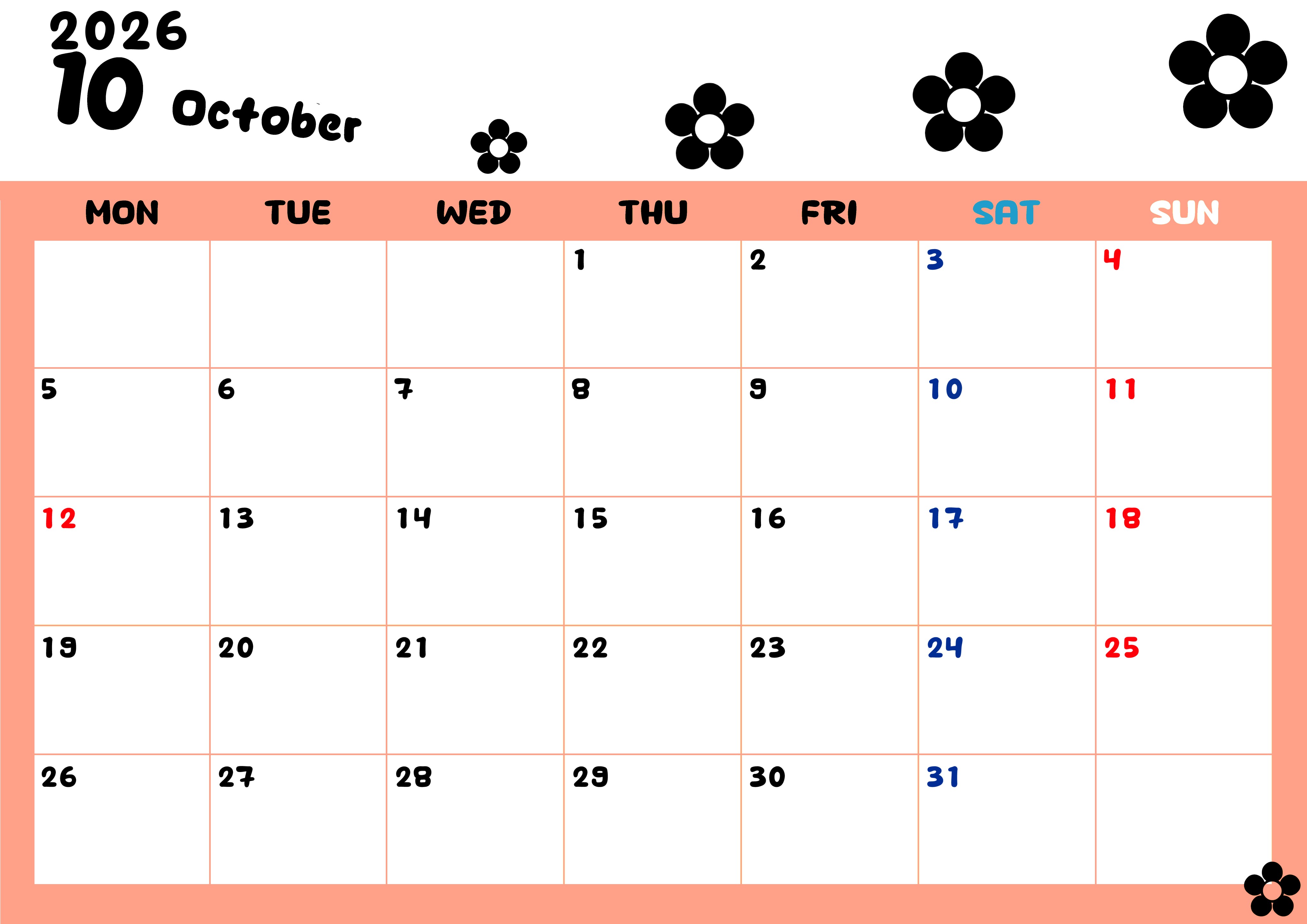 2026年・無料のカレンダーテンプレート 2026年10月カレンダーは横型月曜始まりでフラワーシルエットがかわいいシンプルお花デザイン:無料(2026-01301001) 素材状デザイン王 2025年4月10日 2026年10月カレンダーは横型月曜始まりでフラワーシルエットがかわいいシンプルなお花デザインです。暮らしを豊かにする予定の整理におすすめの無料ダウンロード可能コンテンツです。(2026-01301001) かわいい 10月 草花 横型のカレンダー 月曜始まり カレンダーデザイン-0130