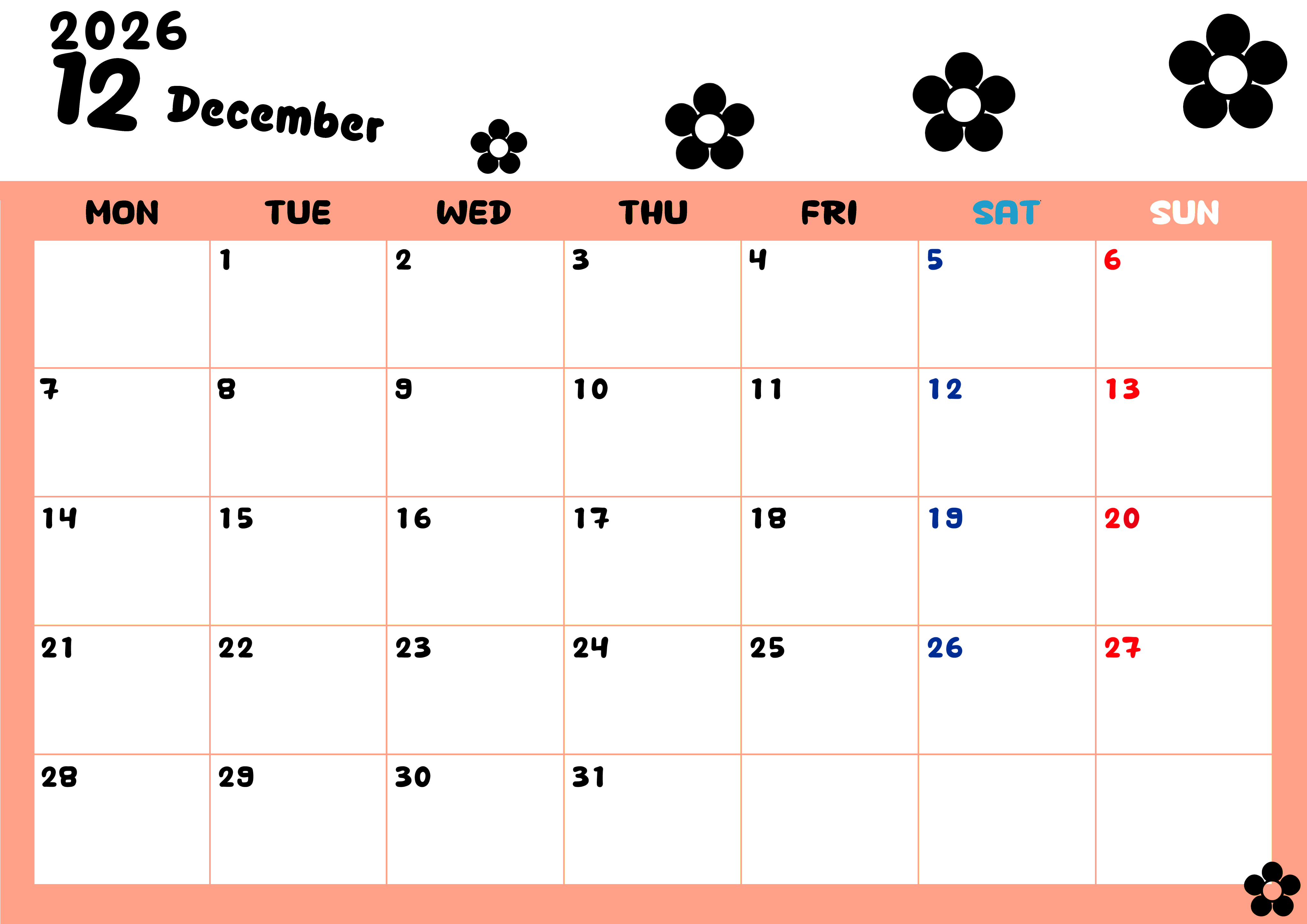 2026年・無料のカレンダーテンプレート 2026年12月カレンダーは横型月曜始まりでフラワーシルエットがかわいいシンプルお花デザイン:無料(2026-01301201) 素材状デザイン王 2025年4月10日 2026年12月カレンダーは横型月曜始まりでフラワーシルエットがかわいいシンプルなお花デザインです。暮らしを豊かにする予定の整理におすすめの無料ダウンロード可能コンテンツです。(2026-01301201) かわいい 12月 草花 横型のカレンダー 月曜始まり カレンダーデザイン-0130