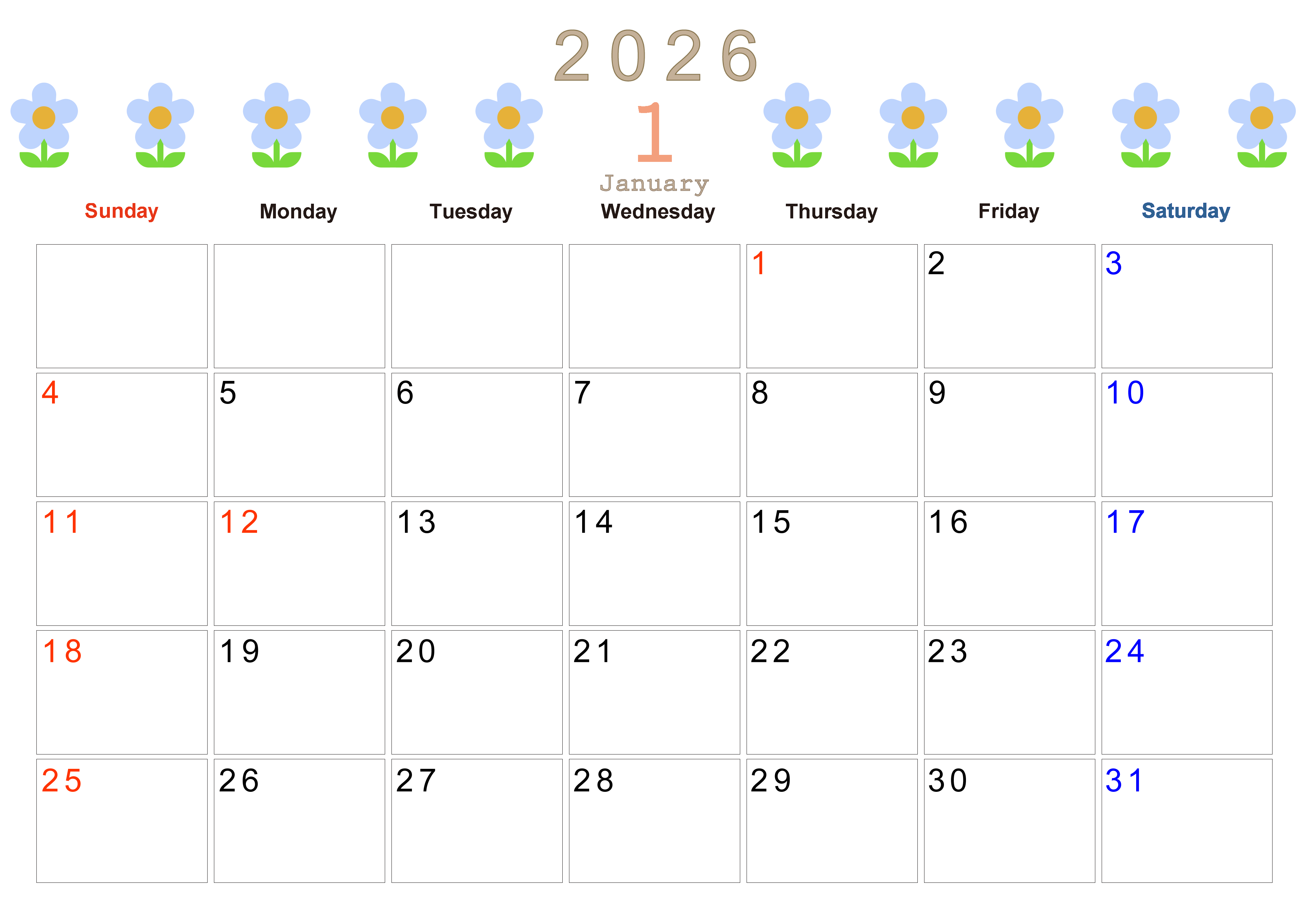 2026年1月カレンダーは横型日曜始まりでおしゃれな花のイラストが暮らしに癒しを与えてくれるイラストつきです。無料でダウンロードができるので印刷をしてスケジュールを楽しく書き込みましょう。(2026-01310100)