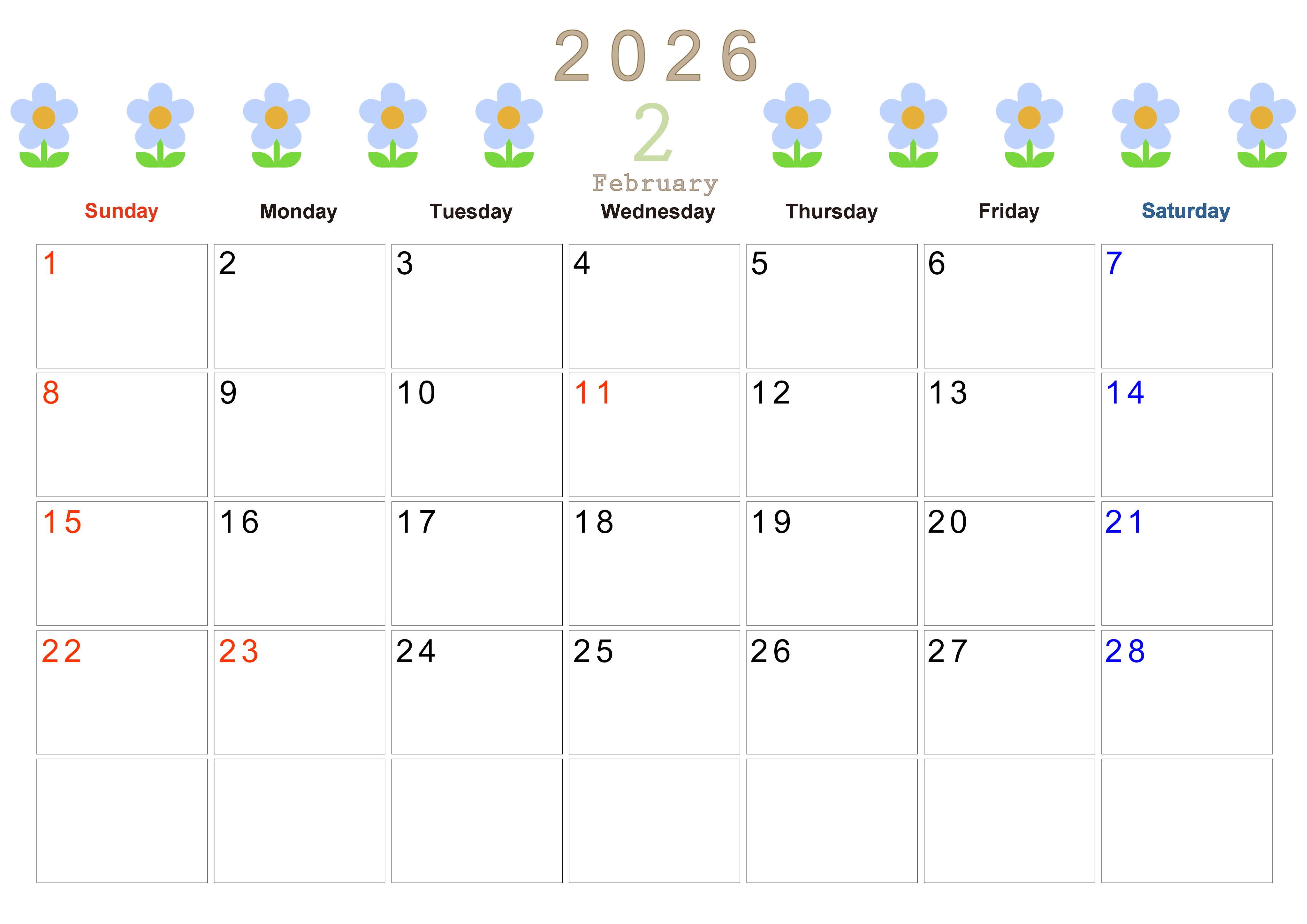 2026年2月カレンダーは横型日曜始まりでおしゃれな花のイラストが暮らしに癒しを与えてくれるイラストつきです。無料でダウンロードができるので印刷をしてスケジュールを楽しく書き込みましょう。(2026-01310200)