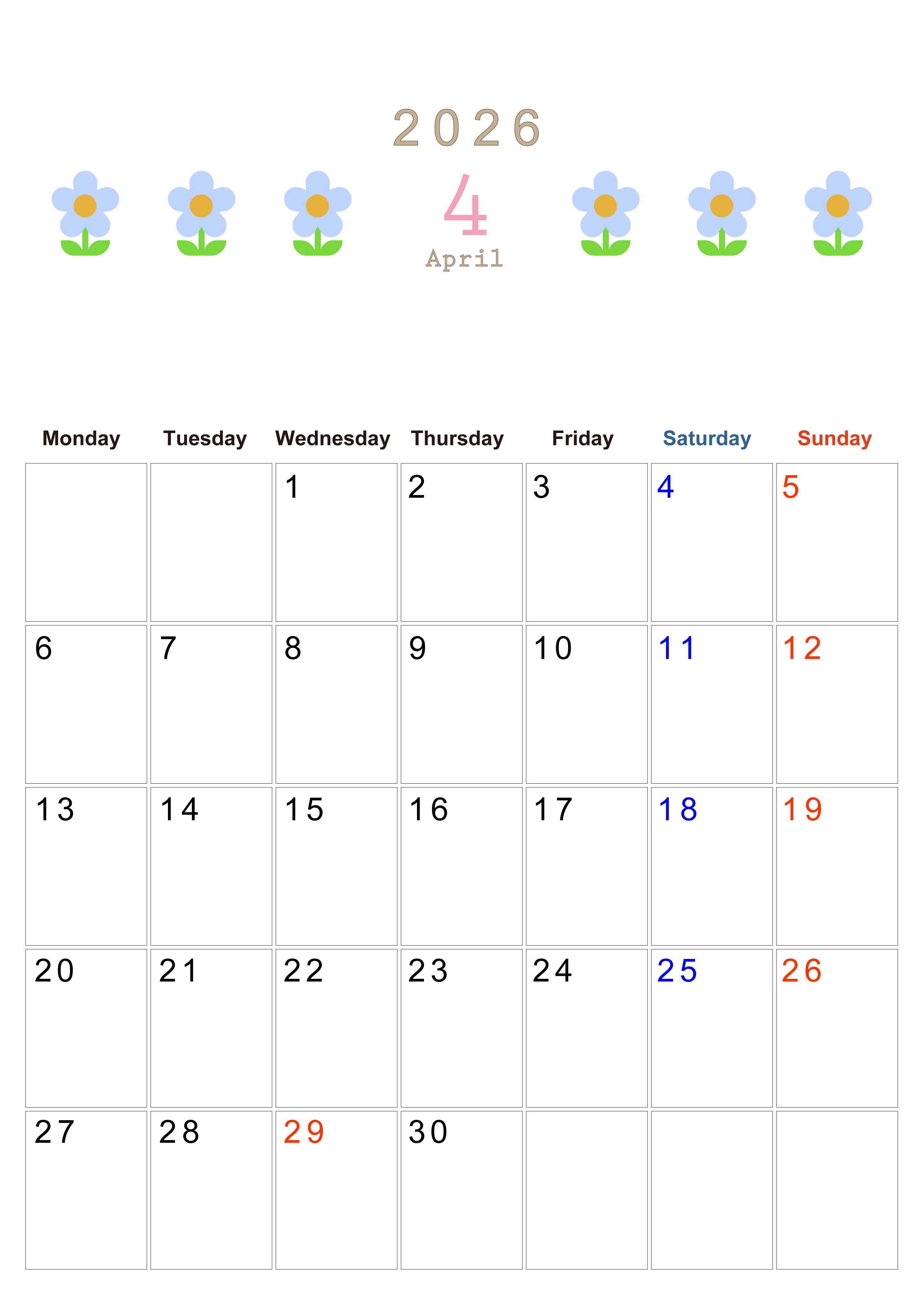 2026年・無料のカレンダーテンプレート 2026年4月カレンダーは縦型月曜始まりでおしゃれな花のイラストが暮らしに癒しを与えてくれる:無料(2026-01310411) 素材状デザイン王 2025年4月10日 2026年4月カレンダーは縦型月曜始まりでおしゃれな花のイラストが暮らしに癒しを与えてくれるイラストつきです。無料でダウンロードができるので印刷をしてスケジュールを楽しく書き込みましょう。(2026-01310411) おしゃれ 4月 草花 縦型のカレンダー 月曜始まり カレンダーデザイン-0131