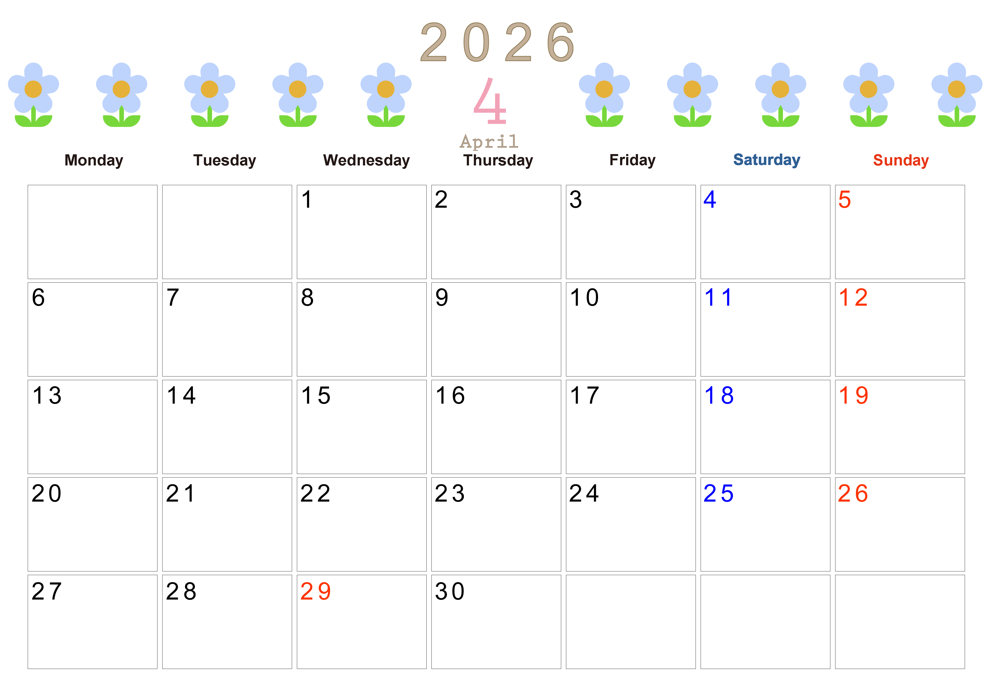 2026年・無料のカレンダーテンプレート 2026年4月カレンダーは横型月曜始まりでおしゃれな花のイラストが暮らしに癒しを与えてくれる:無料(2026-01310401) 素材状デザイン王 2025年4月10日 2026年4月カレンダーは横型月曜始まりでおしゃれな花のイラストが暮らしに癒しを与えてくれるイラストつきです。無料でダウンロードができるので印刷をしてスケジュールを楽しく書き込みましょう。(2026-01310401) おしゃれ 4月 草花 横型のカレンダー 月曜始まり カレンダーデザイン-0131