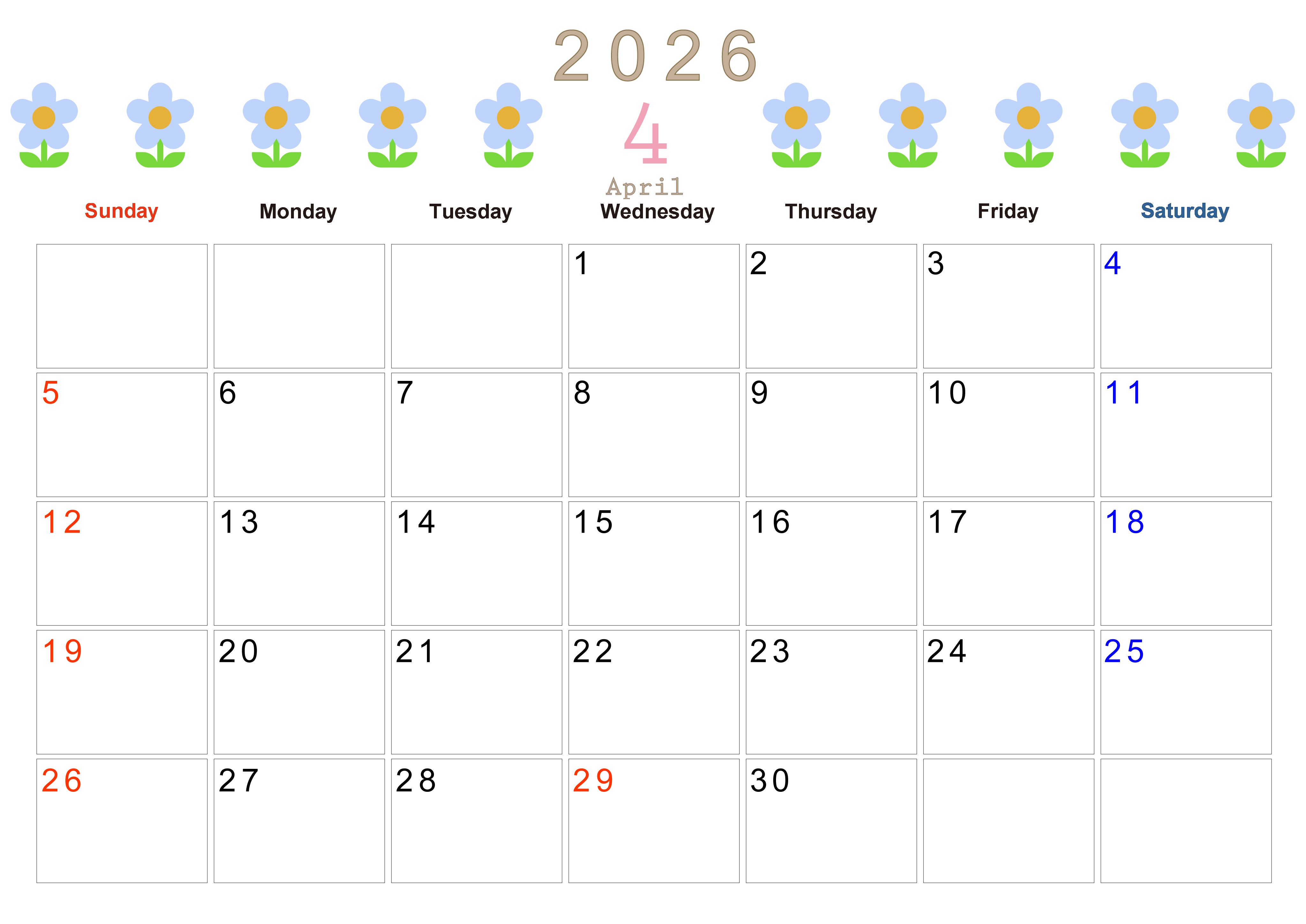 2026年・無料のカレンダーテンプレート 2026年4月カレンダーは横型日曜始まりでおしゃれな花のイラストが暮らしに癒しを与えてくれる:無料(2026-01310400) 素材状デザイン王 2025年4月10日 2026年4月カレンダーは横型日曜始まりでおしゃれな花のイラストが暮らしに癒しを与えてくれるイラストつきです。無料でダウンロードができるので印刷をしてスケジュールを楽しく書き込みましょう。(2026-01310400) おしゃれ 4月 草花 横型のカレンダー 日曜始まり カレンダーデザイン-0131