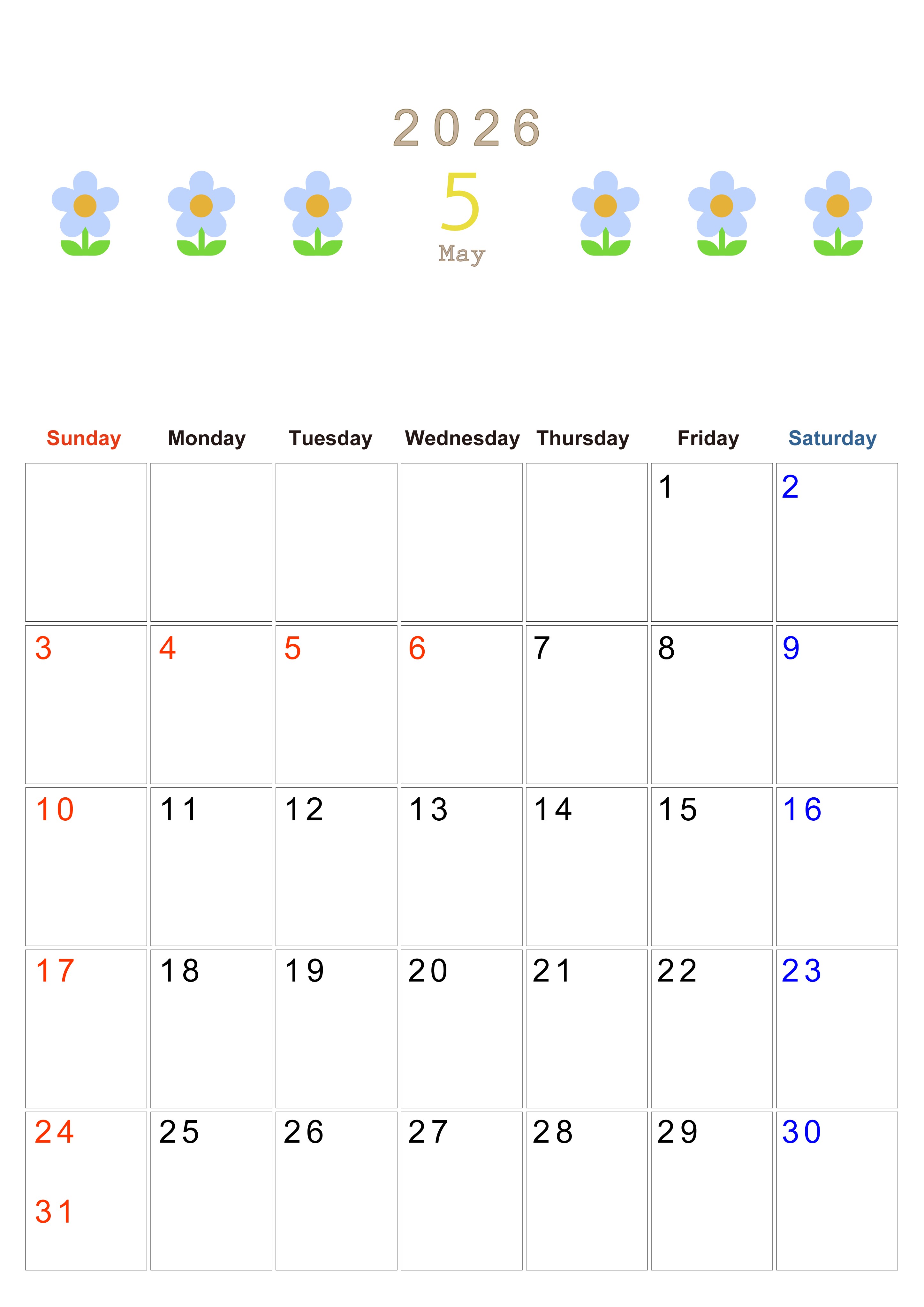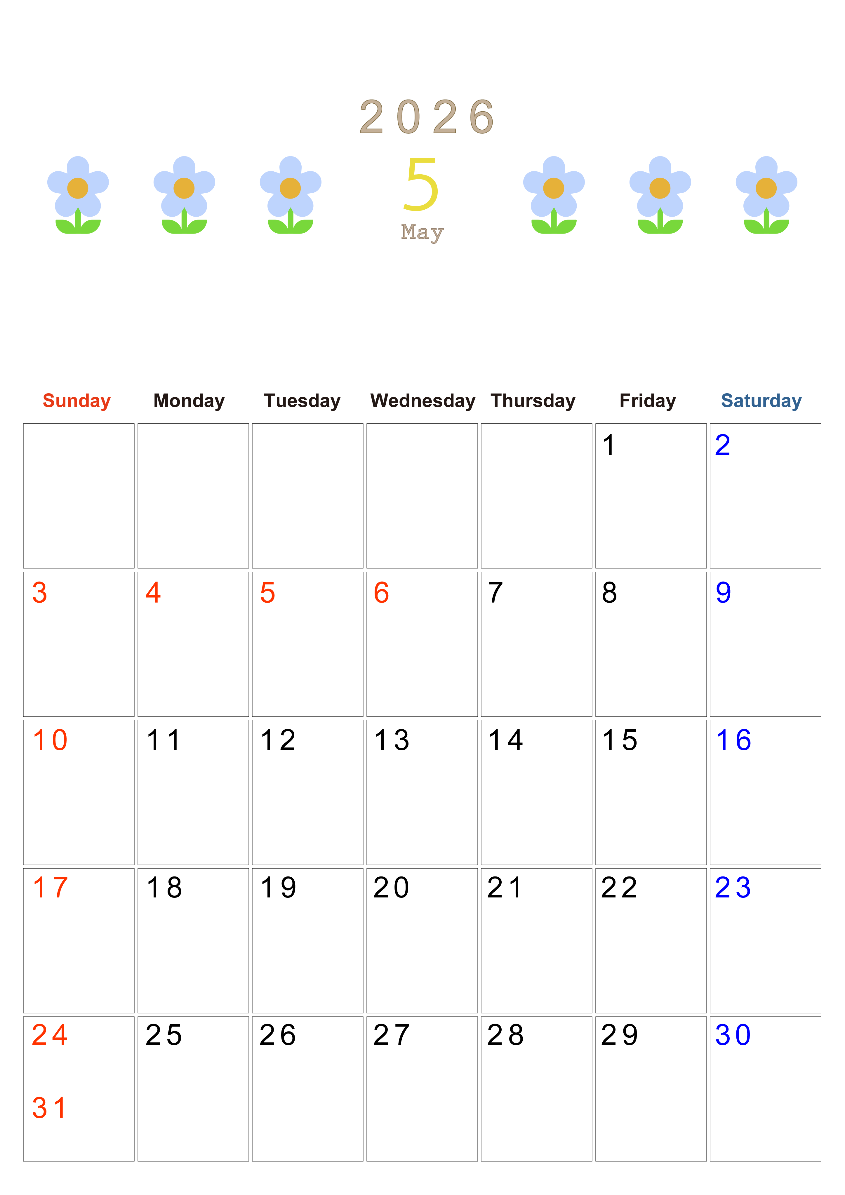 2026年5月カレンダーは縦型日曜始まりでおしゃれな花のイラストが暮らしに癒しを与えてくれるイラストつきです。無料でダウンロードができるので印刷をしてスケジュールを楽しく書き込みましょう。(2026-01310510)