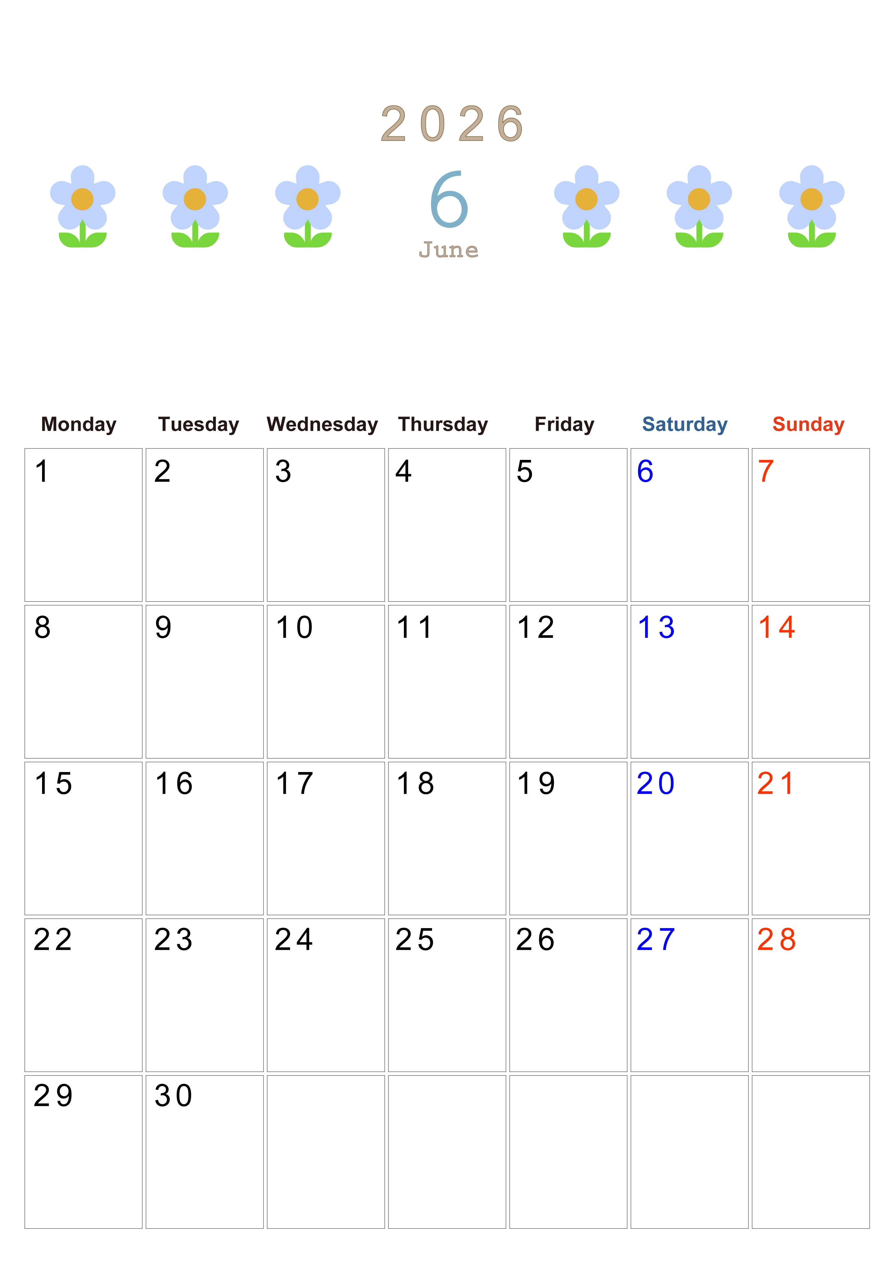 2026年・無料のカレンダーテンプレート 2026年6月カレンダーは縦型月曜始まりでおしゃれな花のイラストが暮らしに癒しを与えてくれる:無料(2026-01310611) 素材状デザイン王 2025年4月10日 2026年6月カレンダーは縦型月曜始まりでおしゃれな花のイラストが暮らしに癒しを与えてくれるイラストつきです。無料でダウンロードができるので印刷をしてスケジュールを楽しく書き込みましょう。(2026-01310611) おしゃれ 6月 草花 縦型のカレンダー 月曜始まり カレンダーデザイン-0131