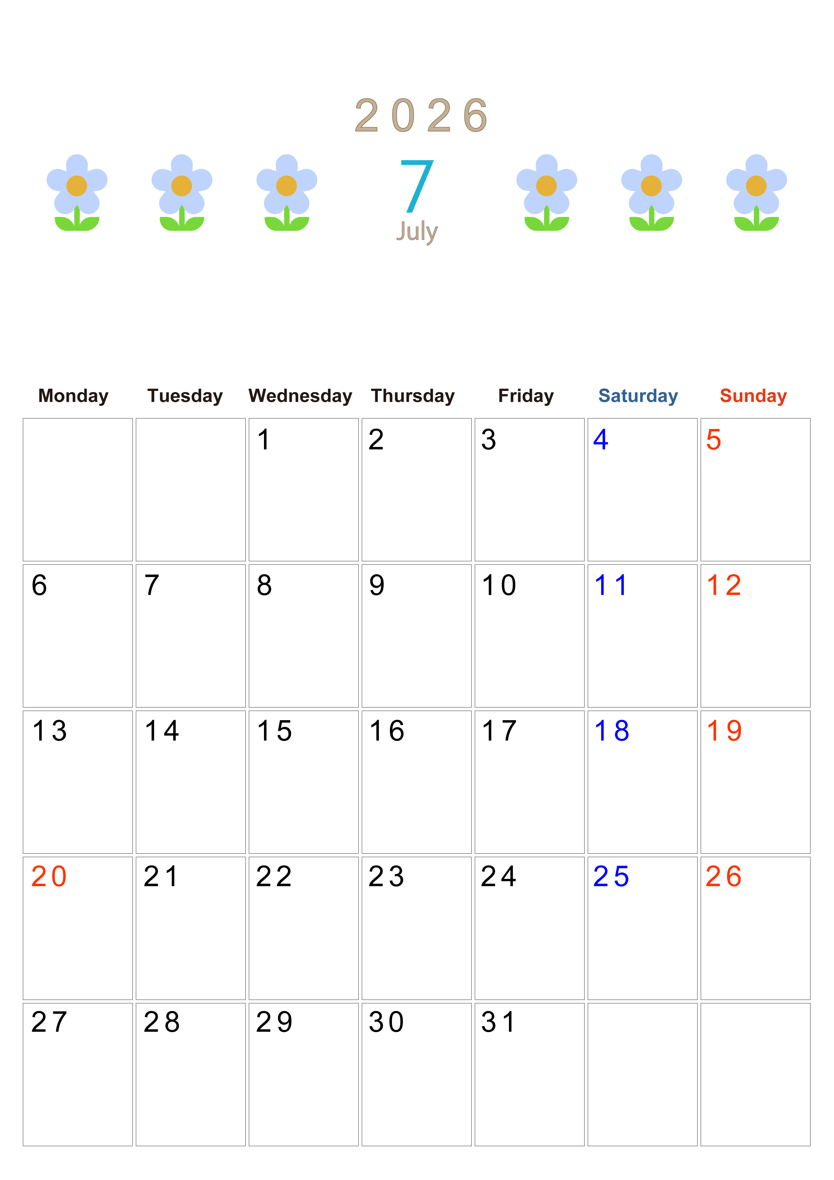 2026年・無料のカレンダーテンプレート 2026年7月カレンダーは縦型月曜始まり でおしゃれな花のイラストが暮らしに癒しを与えてくれる:無料(2026-01310711) 素材状デザイン王 2025年4月10日 2026年7月カレンダーは縦型月曜始まりでおしゃれな花のイラストが暮らしに癒しを与えてくれるイラストつきです。無料でダウンロードができるので印刷をしてスケジュールを楽しく書き込みましょう。(2026-01310711) おしゃれ 7月 草花 縦型のカレンダー 月曜始まり カレンダーデザイン-0131