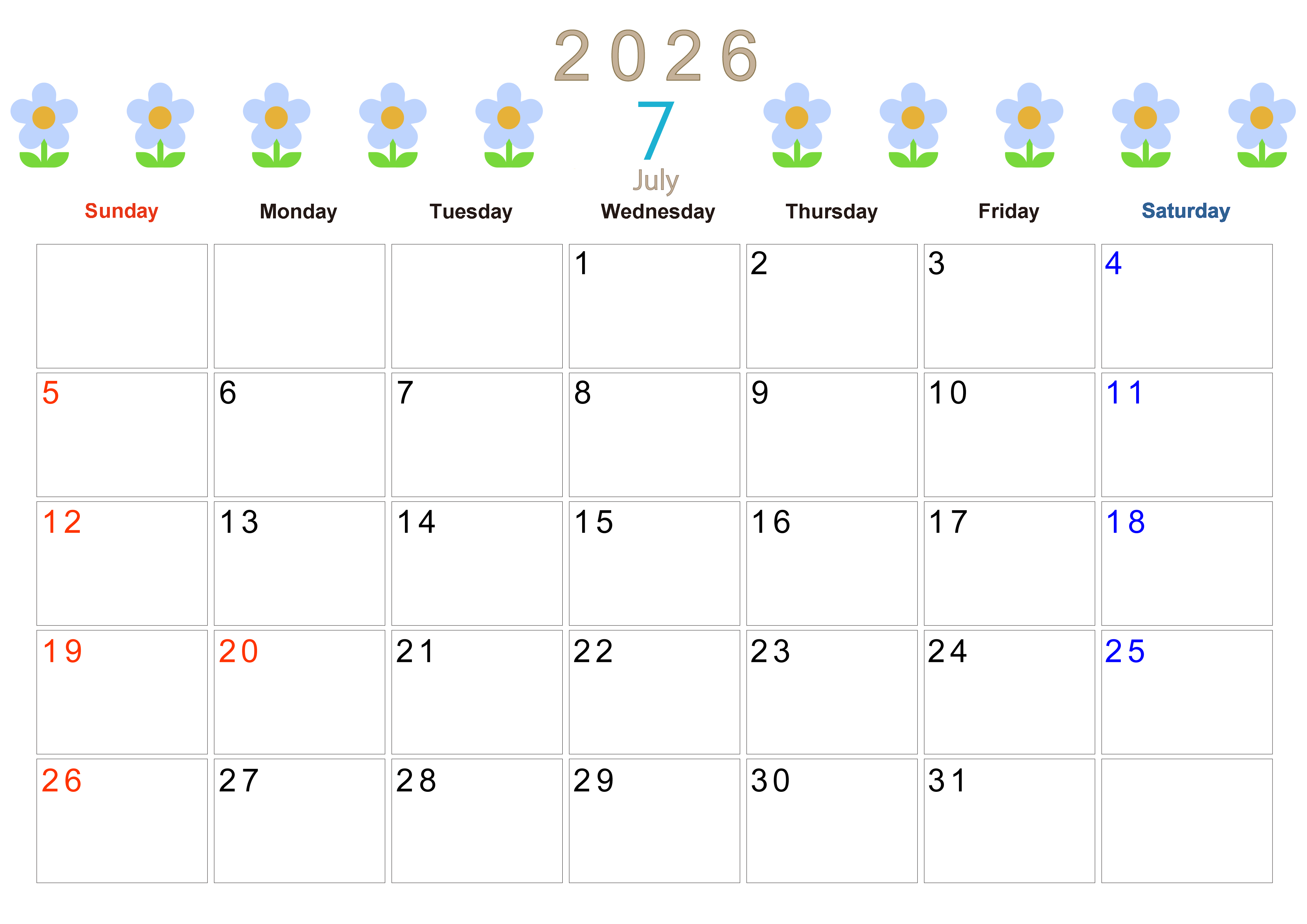 2026年・無料のカレンダーテンプレート 2026年7月カレンダーは横型日曜始まりでおしゃれな花のイラストが暮らしに癒しを与えてくれる:無料(2026-01310700) 素材状デザイン王 2025年4月10日 2026年7月カレンダーは横型日曜始まりでおしゃれな花のイラストが暮らしに癒しを与えてくれるイラストつきです。無料でダウンロードができるので印刷をしてスケジュールを楽しく書き込みましょう。(2026-01310700) おしゃれ 7月 草花 横型のカレンダー 日曜始まり カレンダーデザイン-0131