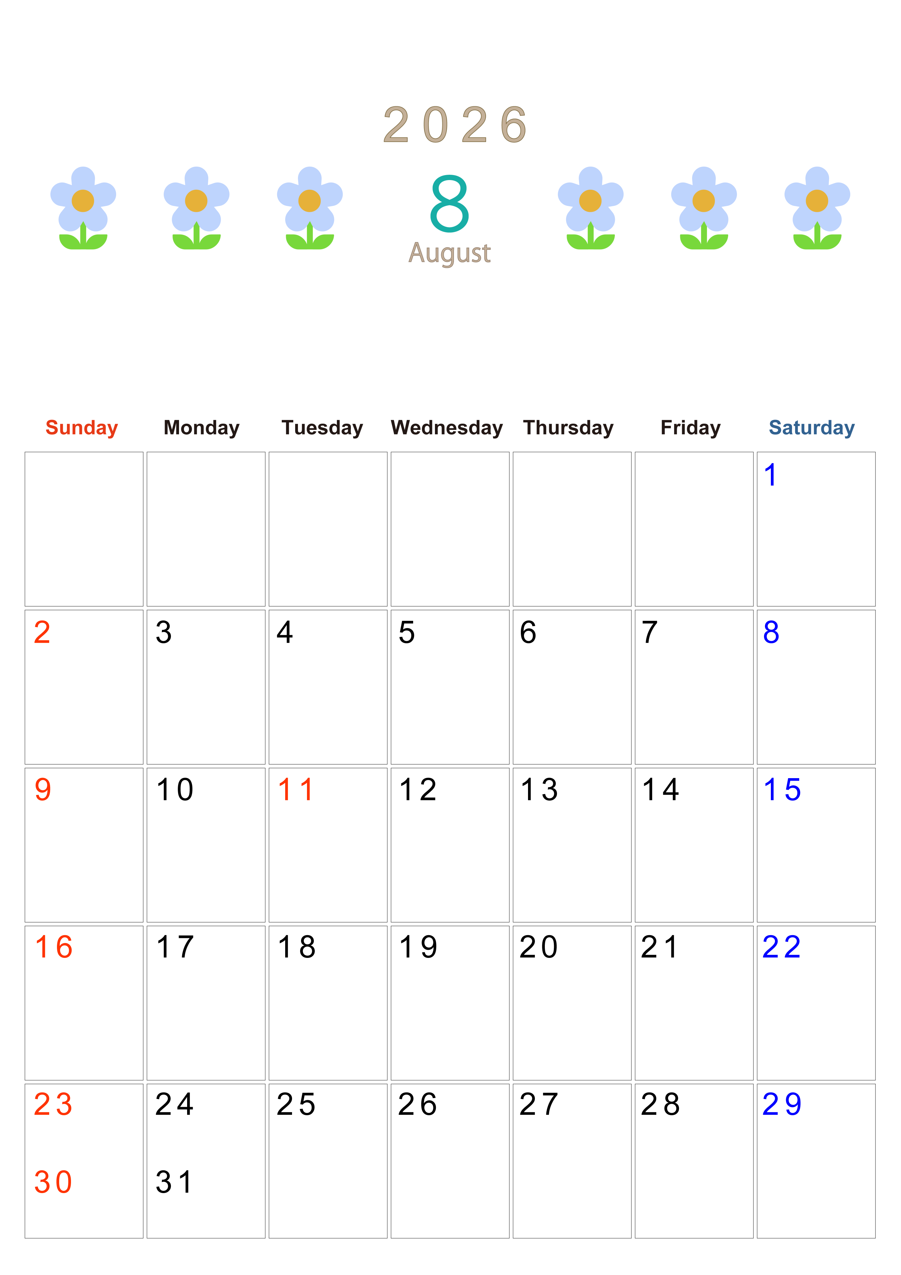 2026年・無料のカレンダーテンプレート 2026年8月カレンダーは縦型日曜始まりでおしゃれな花のイラストが暮らしに癒しを与えてくれる:無料(2026-01310810) 素材状デザイン王 2025年4月10日 2026年8月カレンダーは縦型日曜始まりでおしゃれな花のイラストが暮らしに癒しを与えてくれるイラストつきです。無料でダウンロードができるので印刷をしてスケジュールを楽しく書き込みましょう。(2026-01310810) おしゃれ 8月 草花 縦型のカレンダー 日曜始まり カレンダーデザイン-0131