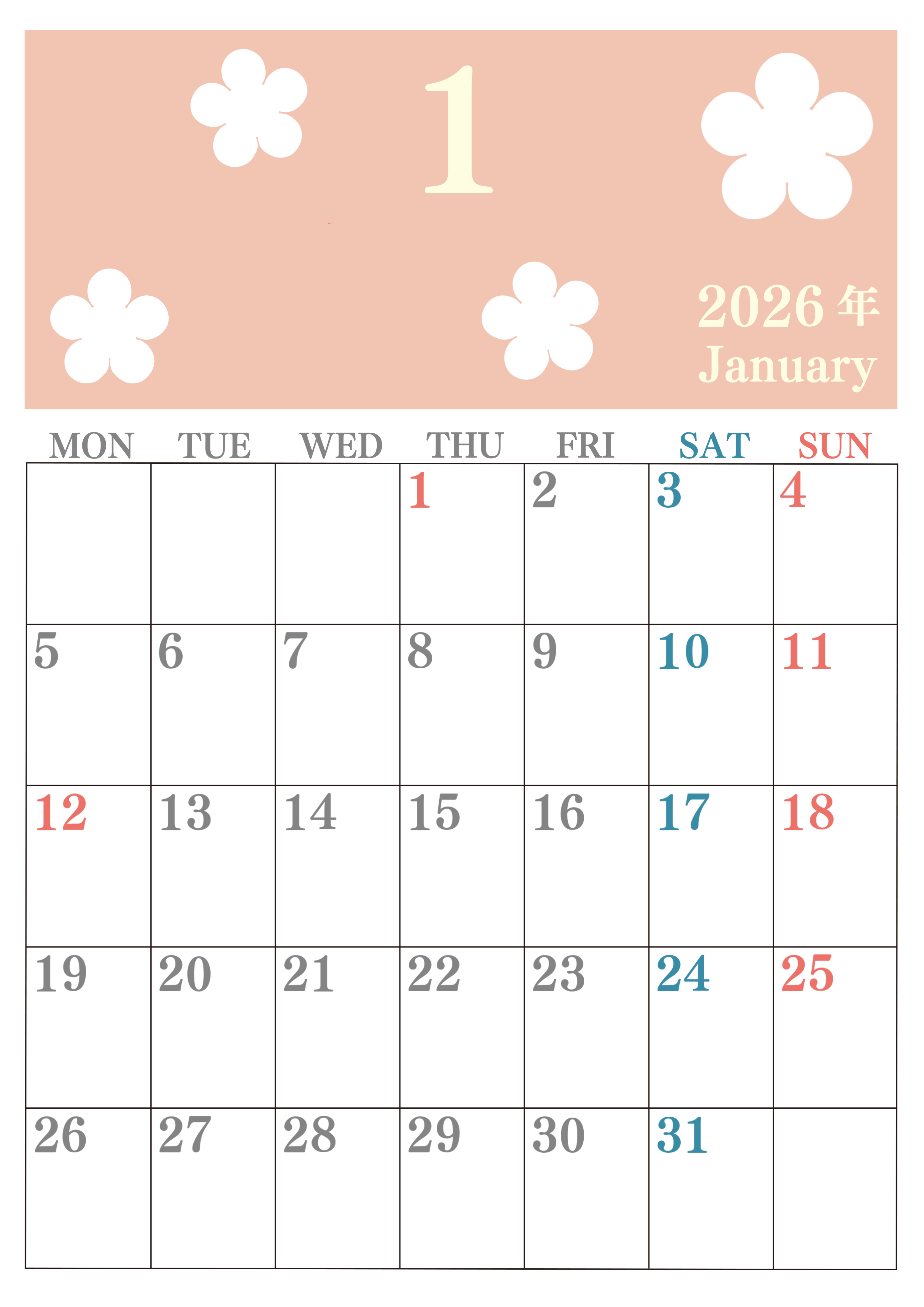 2026年・無料のカレンダーテンプレート 2026年1月カレンダーは縦型月曜始まりでフラワーシルエットがかわいい♪ダウンロードは無料♪(2026-01320111) 素材状デザイン王 2025年4月10日 2026年1月カレンダーは縦型月曜始まりでフラワーシルエットがかわいいです。花をテーマにしていて毎月カラフルなので暮らしにワクワクを添えられます。無料ダウンロードしましょう。(2026-01320111) かわいい 1月 草花 縦型のカレンダー 月曜始まり カレンダーデザイン-0132