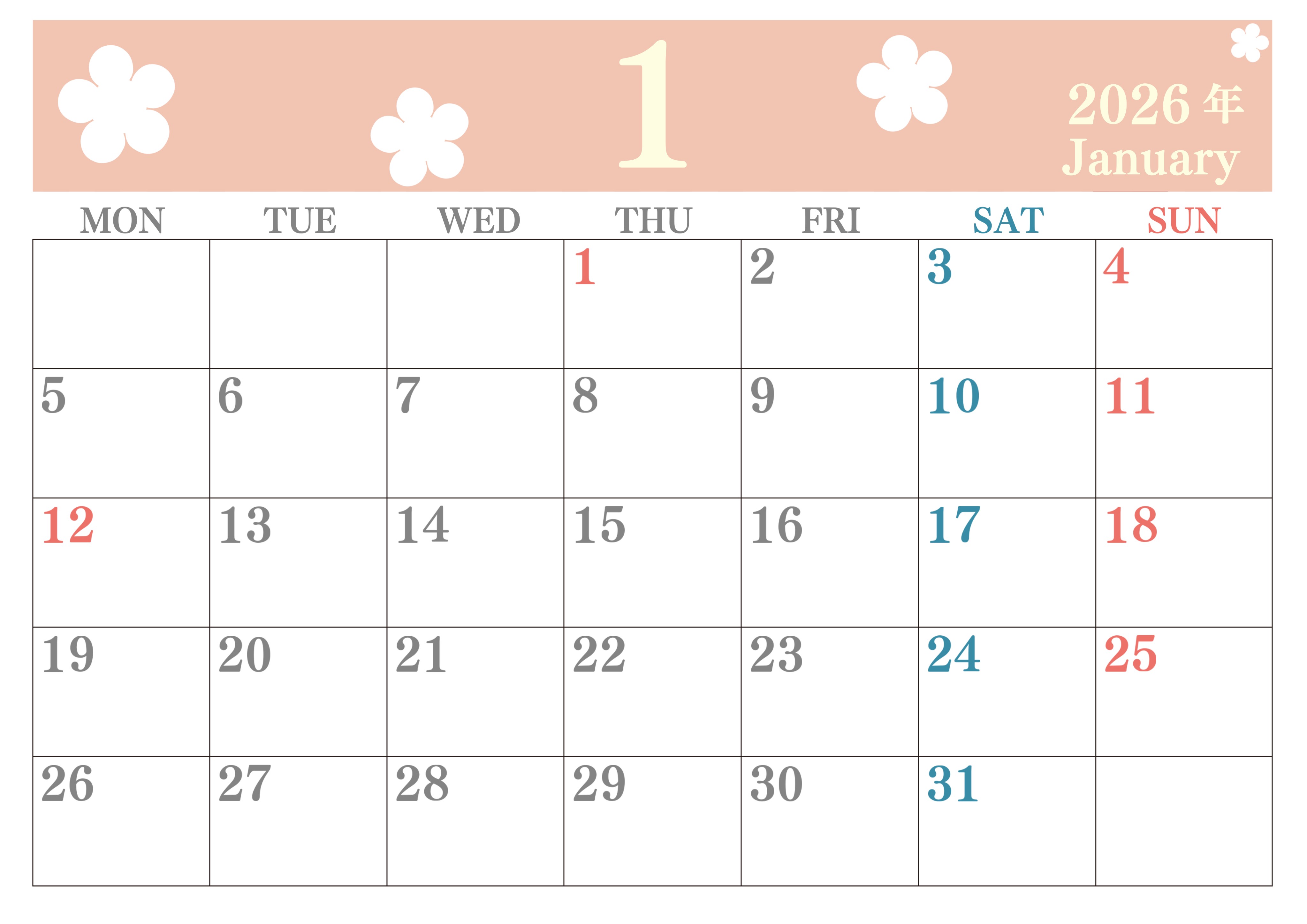 2026年・無料のカレンダーテンプレート 2026年1月カレンダーは横型月曜始まりでフラワーシルエットがかわいい♪ダウンロードは無料♪(2026-01320101) 素材状デザイン王 2025年4月10日 2026年1月カレンダーは横型月曜始まりでフラワーシルエットがかわいいです。花をテーマにしていて毎月カラフルなので暮らしにワクワクを添えられます。無料ダウンロードしましょう。(2026-01320101) かわいい 1月 草花 横型のカレンダー 月曜始まり カレンダーデザイン-0132