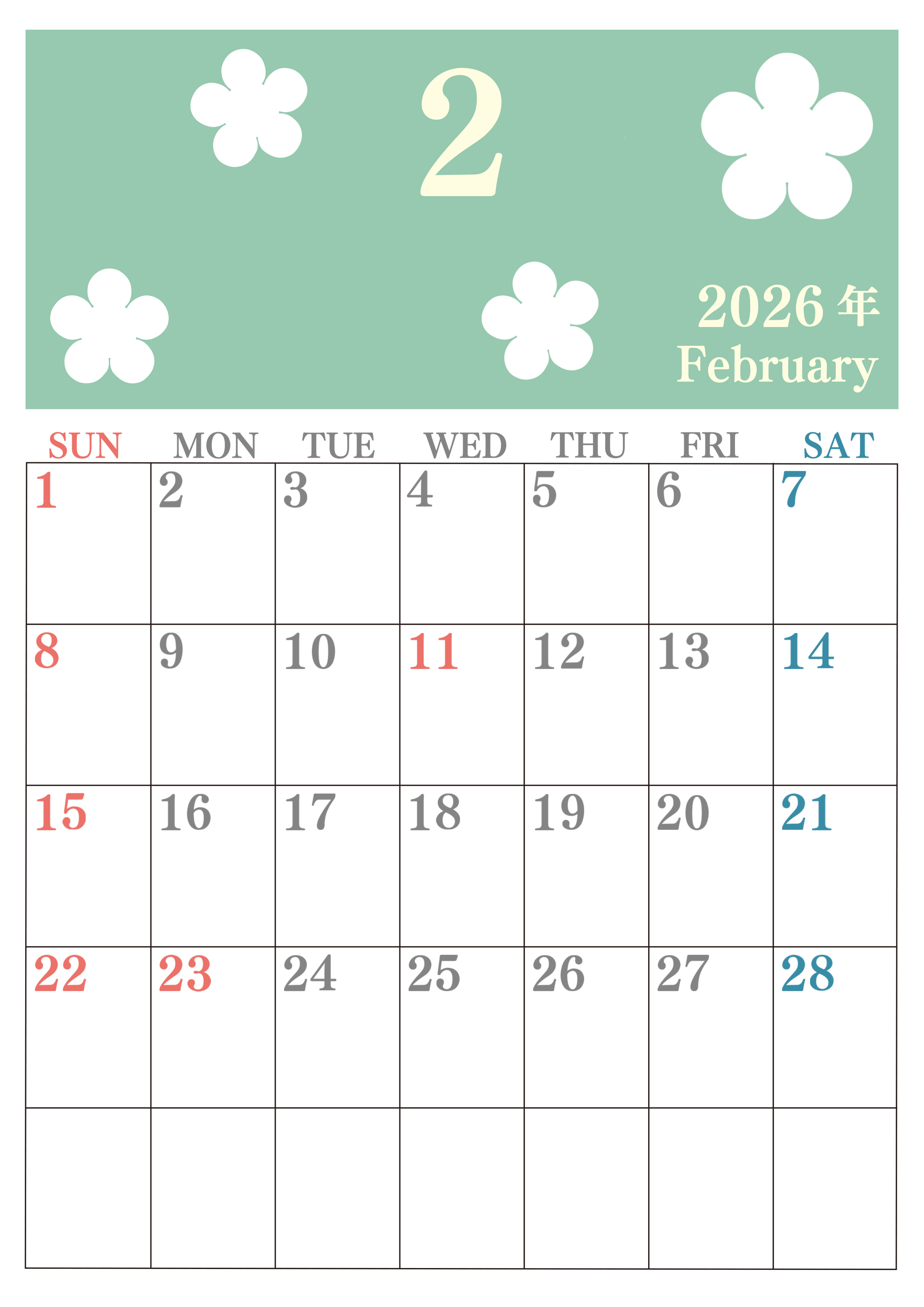 2026年・無料のカレンダーテンプレート 2026年2月カレンダーは縦型日曜始まりでフラワーシルエットがかわいい♪ダウンロードは無料♪(2026-01320210) 素材状デザイン王 2025年4月10日 2026年2月カレンダーは縦型日曜始まりでフラワーシルエットがかわいいです。花をテーマにしていて毎月カラフルなので暮らしにワクワクを添えられます。無料ダウンロードしましょう。(2026-01320210) かわいい 2月 草花 縦型のカレンダー 日曜始まり カレンダーデザイン-0132