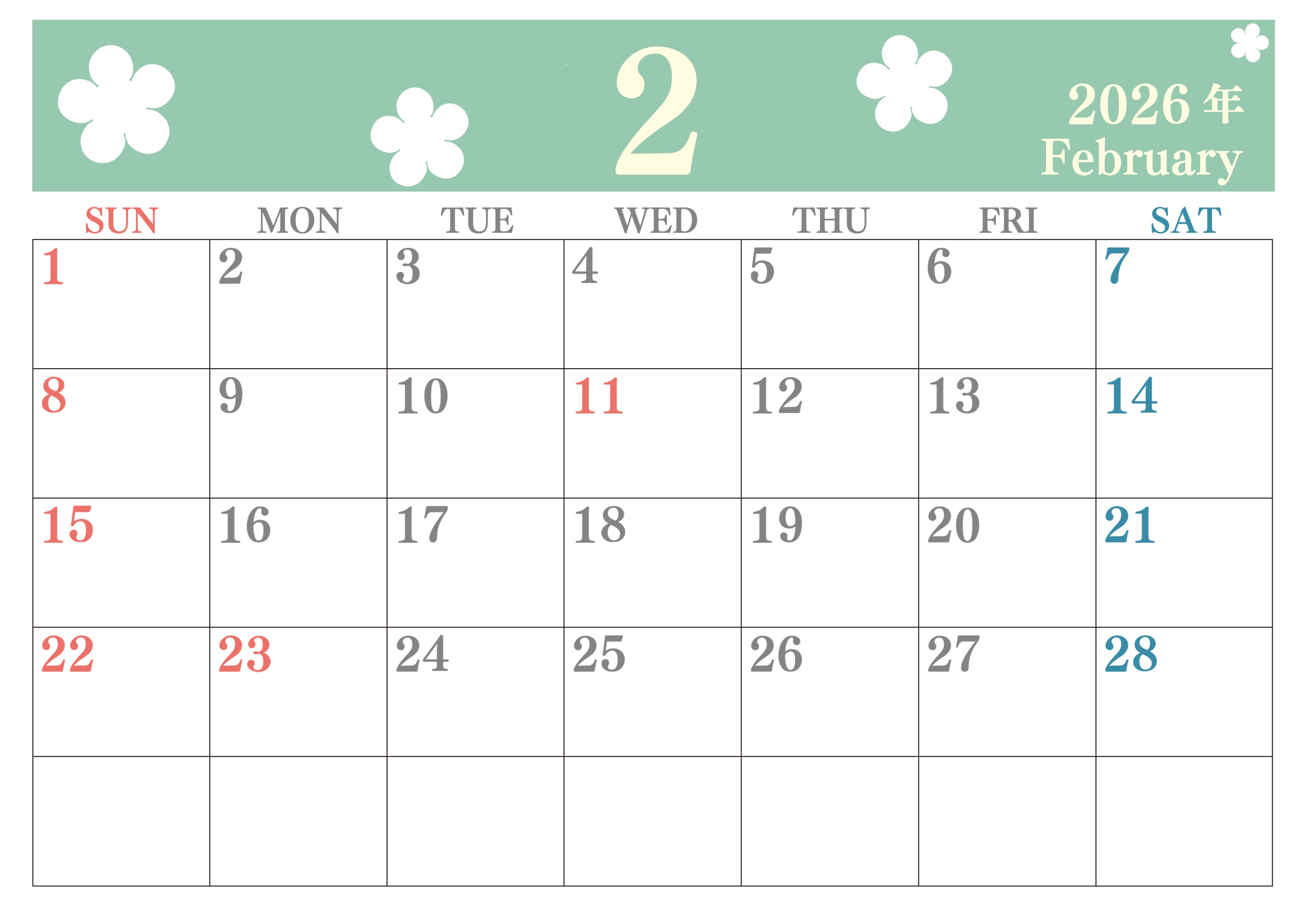 2026年2月カレンダーは横型日曜始まりでフラワーシルエットがかわいいです。花をテーマにしていて毎月カラフルなので暮らしにワクワクを添えられます。無料ダウンロードしましょう。(2026-01320200)