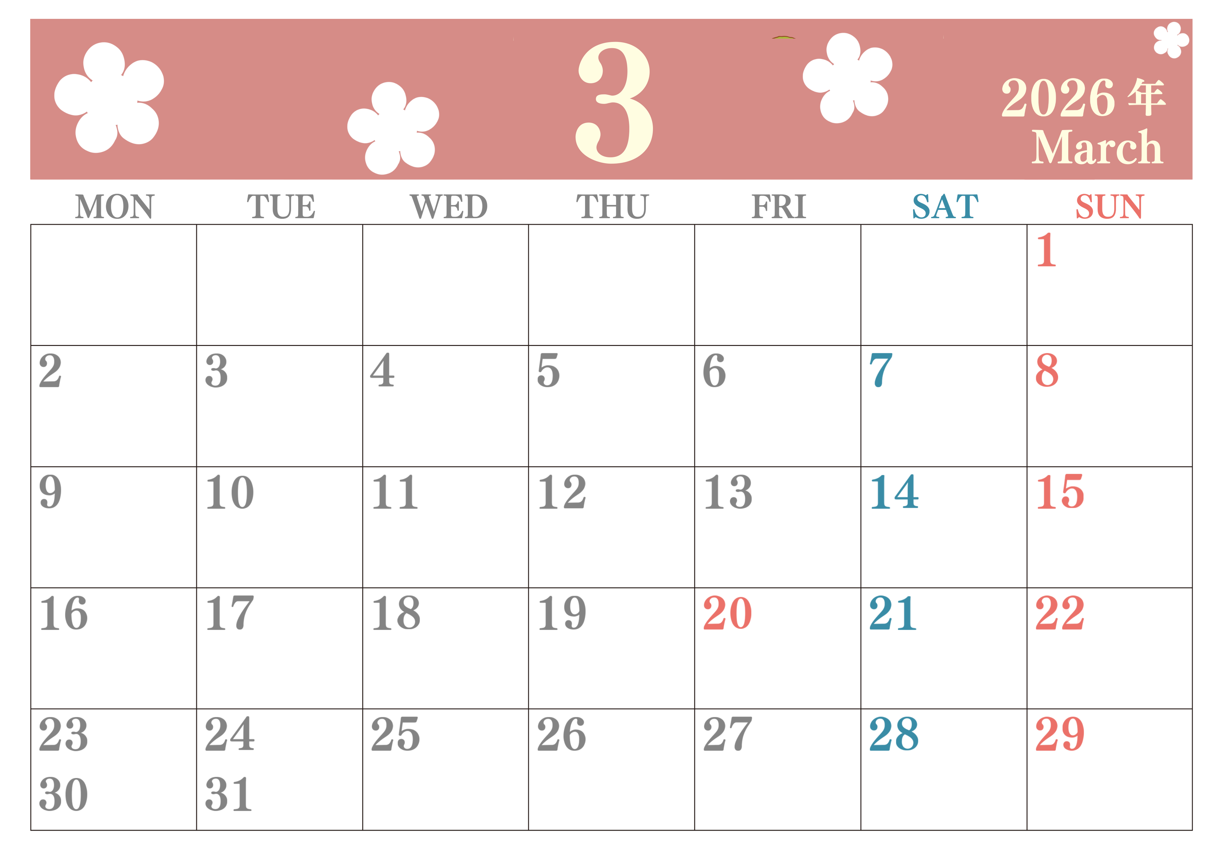 2026年3月カレンダーは横型月曜始まりでフラワーシルエットがかわいい♪ダウンロードは無料♪(2026-01320301)
