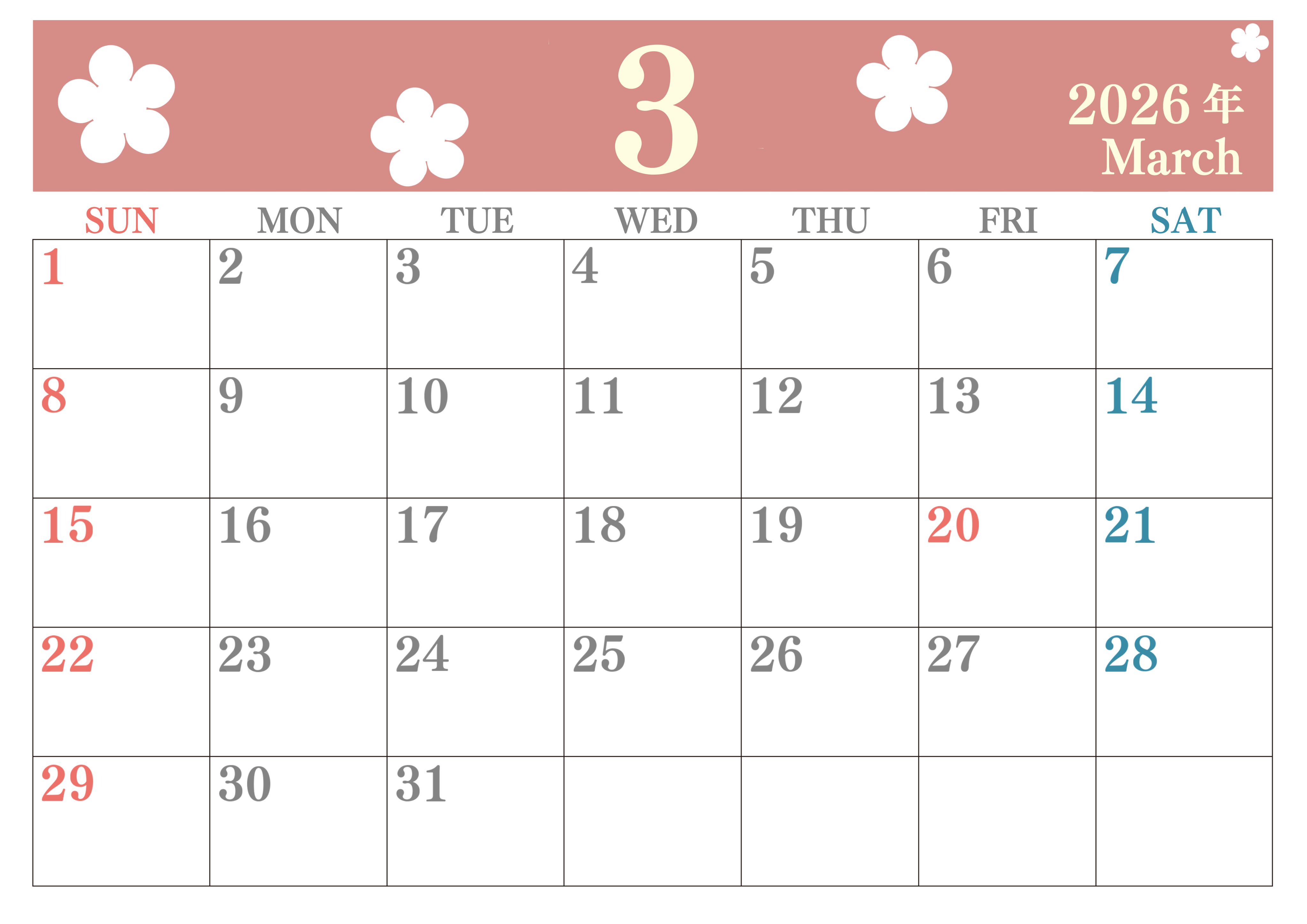 2026年・無料のカレンダーテンプレート 2026年3月カレンダーは横型日曜始まりでフラワーシルエットがかわいい♪ダウンロードは無料♪(2026-01320300) 素材状デザイン王 2025年4月10日 2026年3月カレンダーは横型日曜始まりでフラワーシルエットがかわいいです。花をテーマにしていて毎月カラフルなので暮らしにワクワクを添えられます。無料ダウンロードしましょう。(2026-01320300) かわいい 3月 草花 横型のカレンダー 日曜始まり カレンダーデザイン-0132