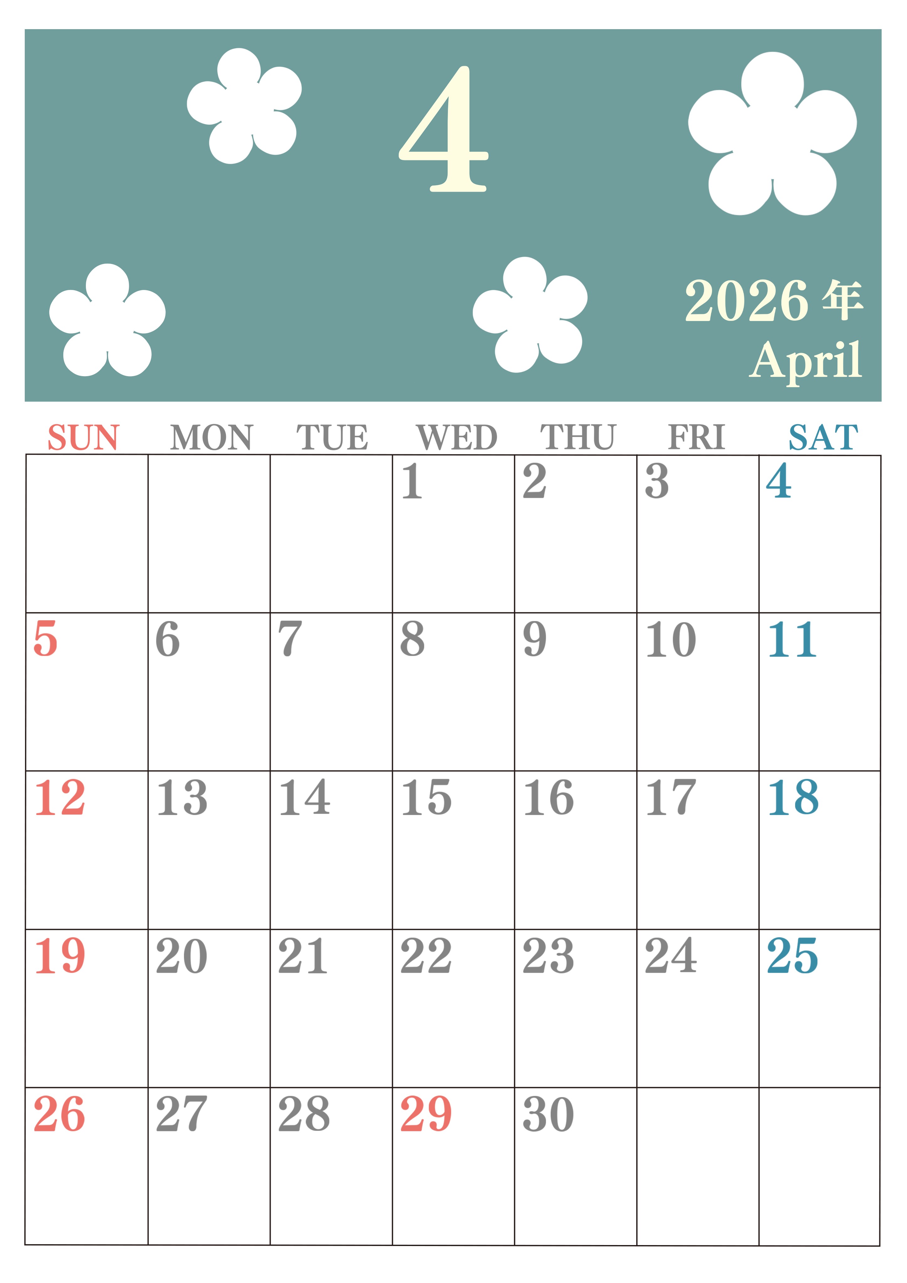 2026年4月カレンダーは縦型日曜始まりでフラワーシルエットがかわいいです。花をテーマにしていて毎月カラフルなので暮らしにワクワクを添えられます。無料ダウンロードしましょう。(2026-01320410)