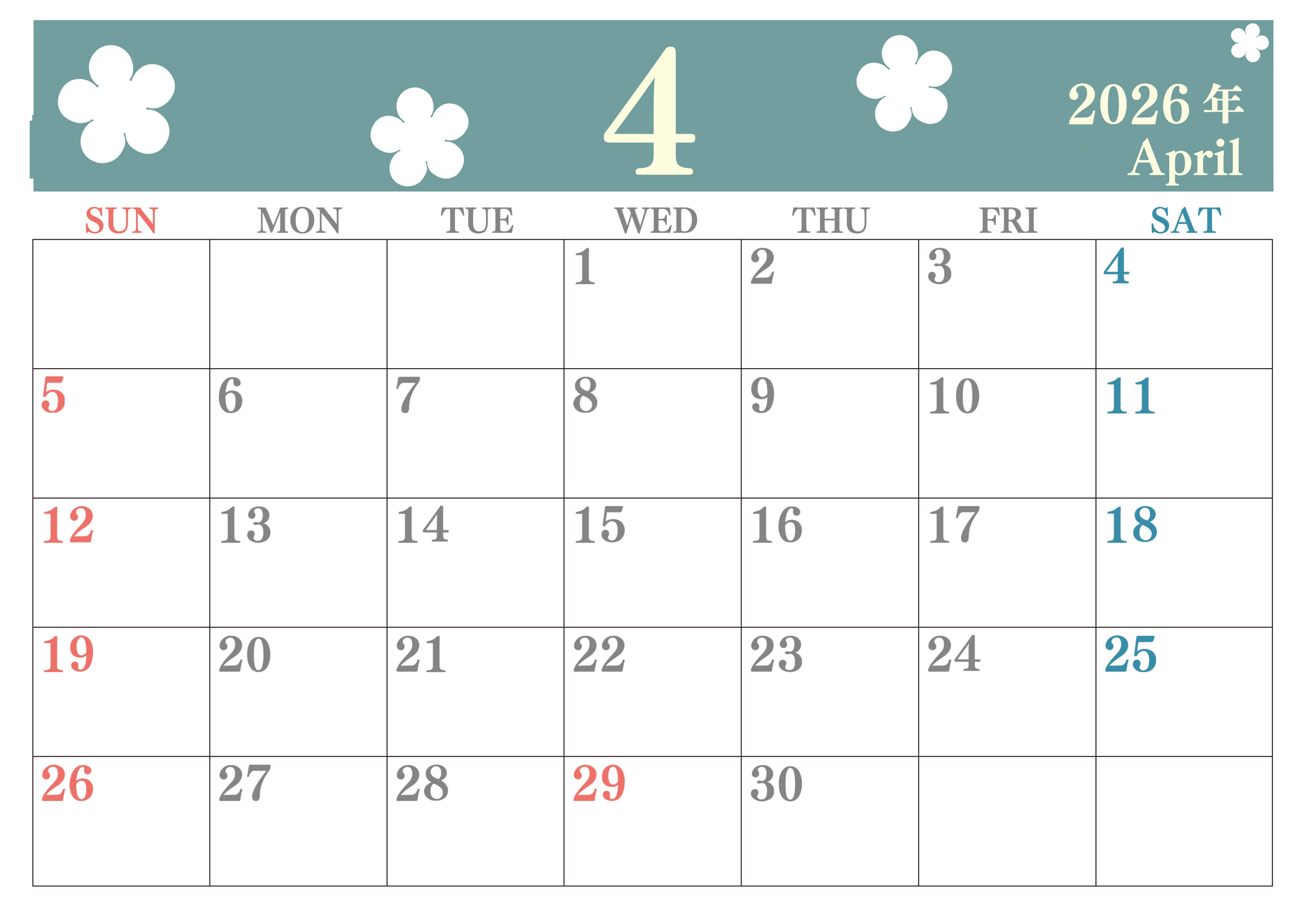 2026年・無料のカレンダーテンプレート 2026年4月カレンダーは横型日曜始まりでフラワーシルエットがかわいい♪ダウンロードは無料♪(2026-01320400) 素材状デザイン王 2025年4月10日 2026年4月カレンダーは横型日曜始まりでフラワーシルエットがかわいいです。花をテーマにしていて毎月カラフルなので暮らしにワクワクを添えられます。無料ダウンロードしましょう。(2026-01320400) かわいい 4月 草花 横型のカレンダー 日曜始まり カレンダーデザイン-0132