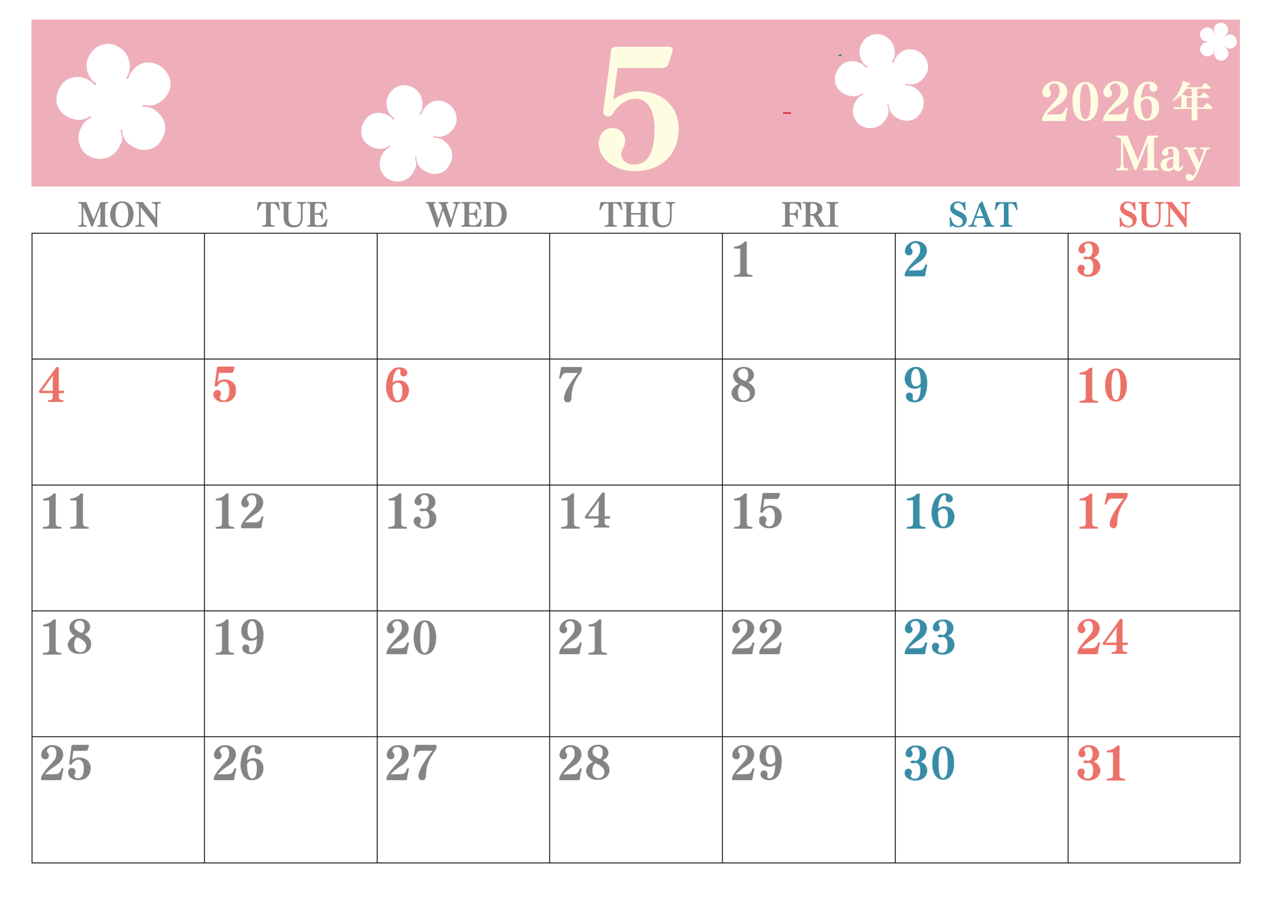 2026年・無料のカレンダーテンプレート 2026年5月カレンダーは横型月曜始まりでフラワーシルエットがかわいい♪ダウンロードは無料♪(2026-01320501) 素材状デザイン王 2025年4月10日 2026年5月カレンダーは横型月曜始まりでフラワーシルエットがかわいいです。花をテーマにしていて毎月カラフルなので暮らしにワクワクを添えられます。無料ダウンロードしましょう。(2026-01320501) かわいい 5月 草花 横型のカレンダー 月曜始まり カレンダーデザイン-0132