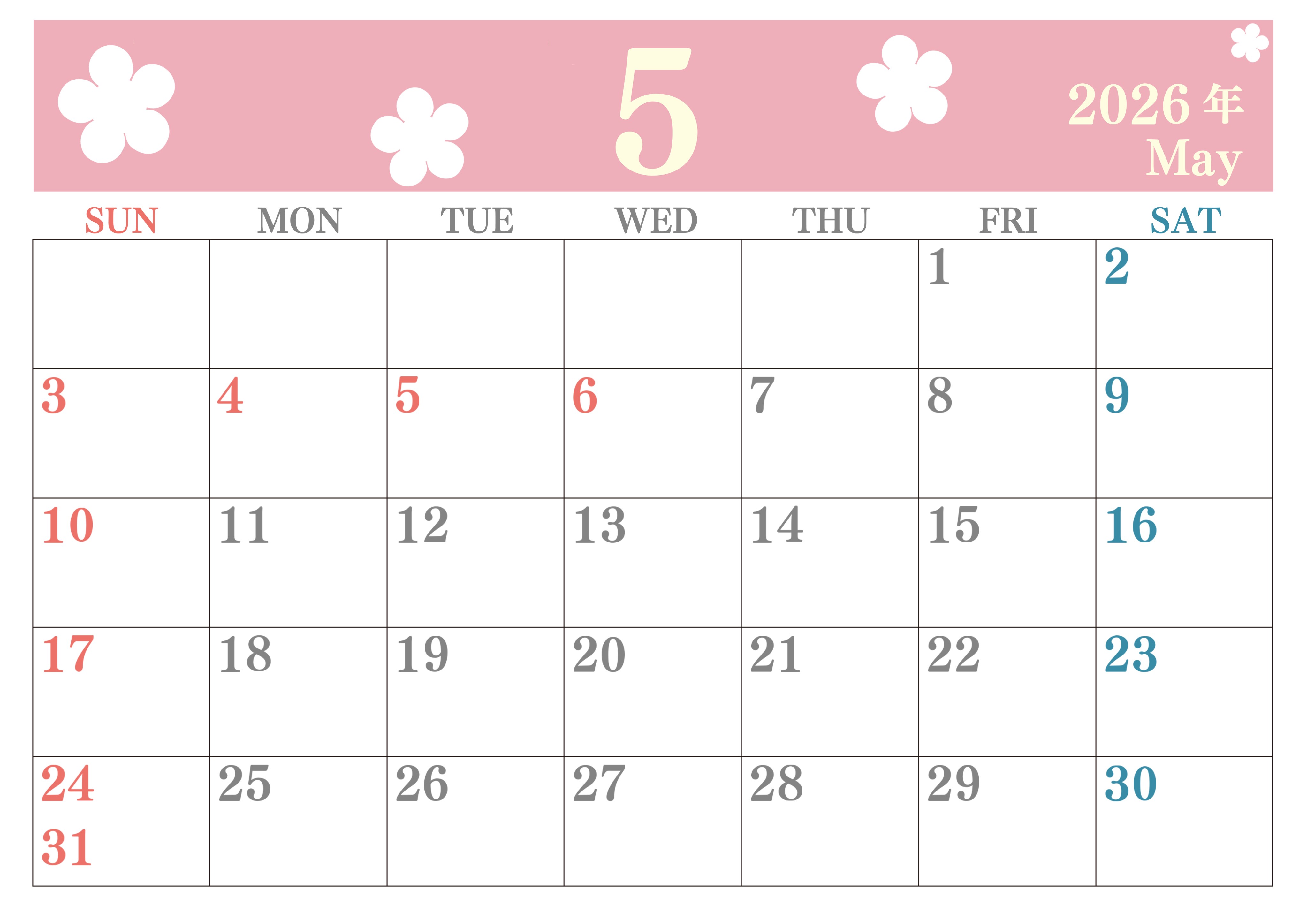 2026年・無料のカレンダーテンプレート 2026年5月カレンダーは横型日曜始まりでフラワーシルエットがかわいい♪ダウンロードは無料♪(2026-01320500) 素材状デザイン王 2025年4月10日 2026年5月カレンダーは横型日曜始まりでフラワーシルエットがかわいいです。花をテーマにしていて毎月カラフルなので暮らしにワクワクを添えられます。無料ダウンロードしましょう。(2026-01320500) かわいい 5月 草花 横型のカレンダー 日曜始まり カレンダーデザイン-0132