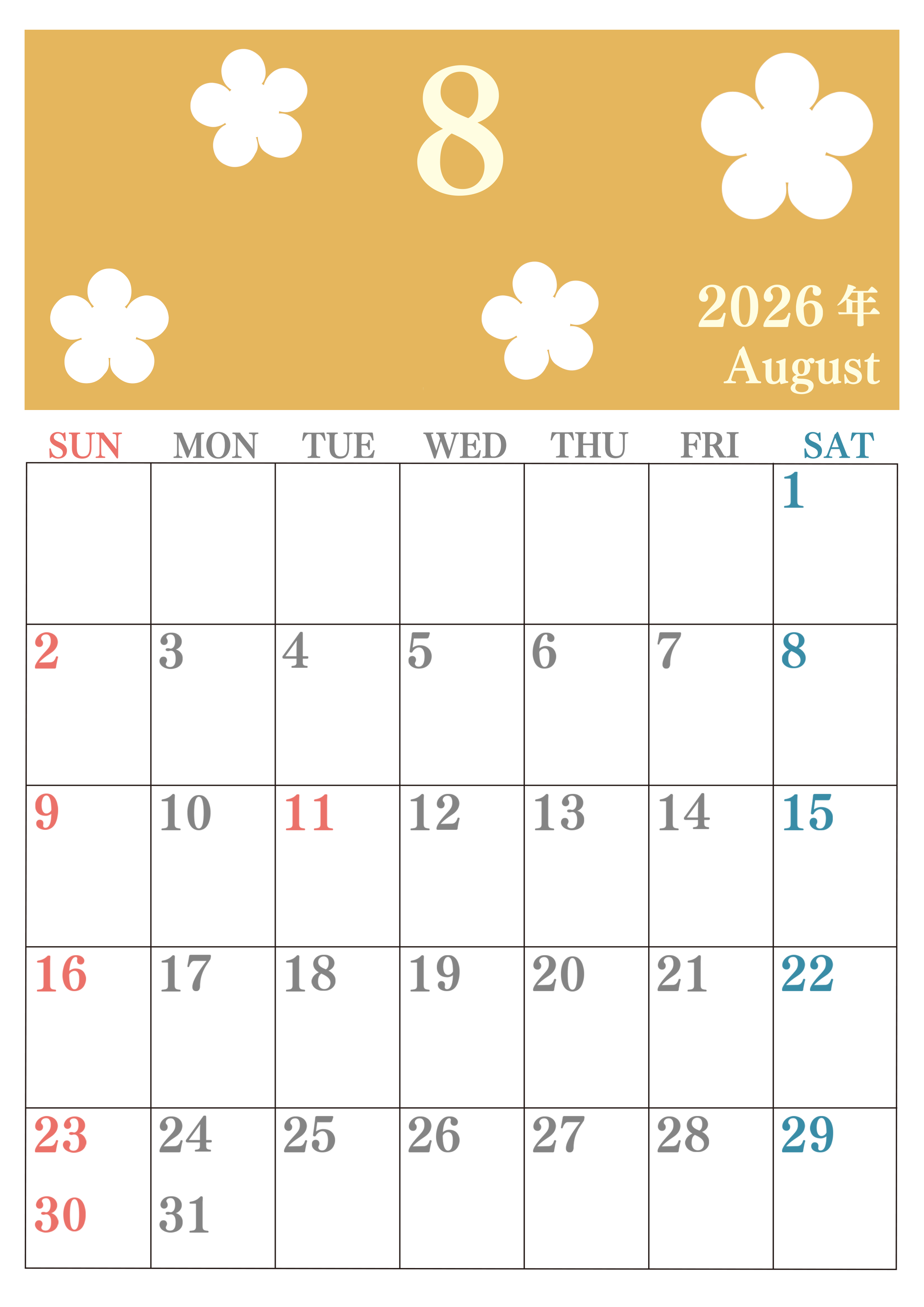 2026年・無料のカレンダーテンプレート 2026年8月カレンダーは縦型日曜始まりでフラワーシルエットがかわいい♪ダウンロードは無料♪(2026-01320810) 素材状デザイン王 2025年4月10日 2026年8月カレンダーは縦型日曜始まりでフラワーシルエットがかわいいです。花をテーマにしていて毎月カラフルなので暮らしにワクワクを添えられます。無料ダウンロードしましょう。(2026-01320810) かわいい 8月 草花 縦型のカレンダー 日曜始まり カレンダーデザイン-0132