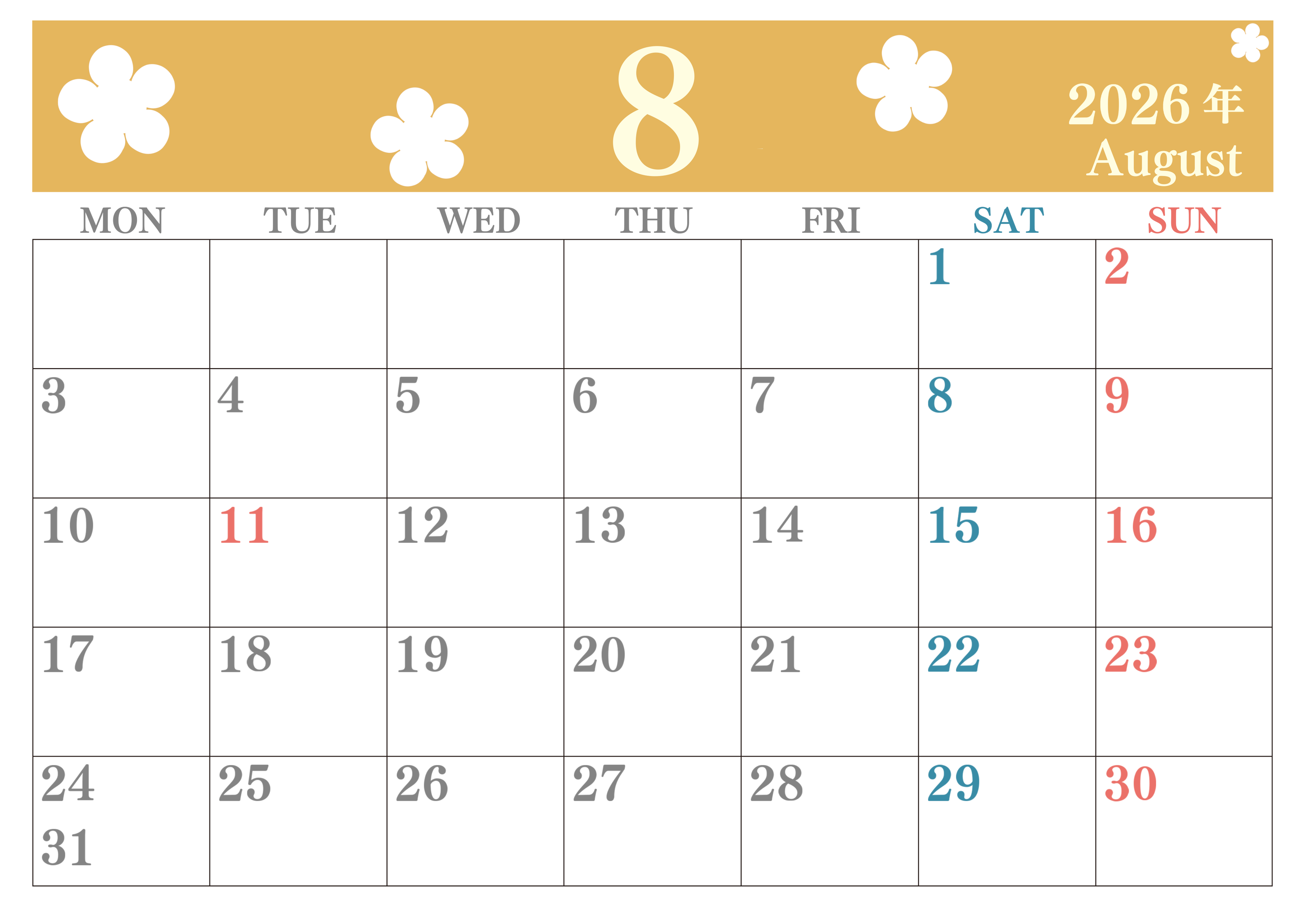 2026年8月カレンダーは横型月曜始まりでフラワーシルエットがかわいいです。花をテーマにしていて毎月カラフルなので暮らしにワクワクを添えられます。無料ダウンロードしましょう。(2026-01320801)
