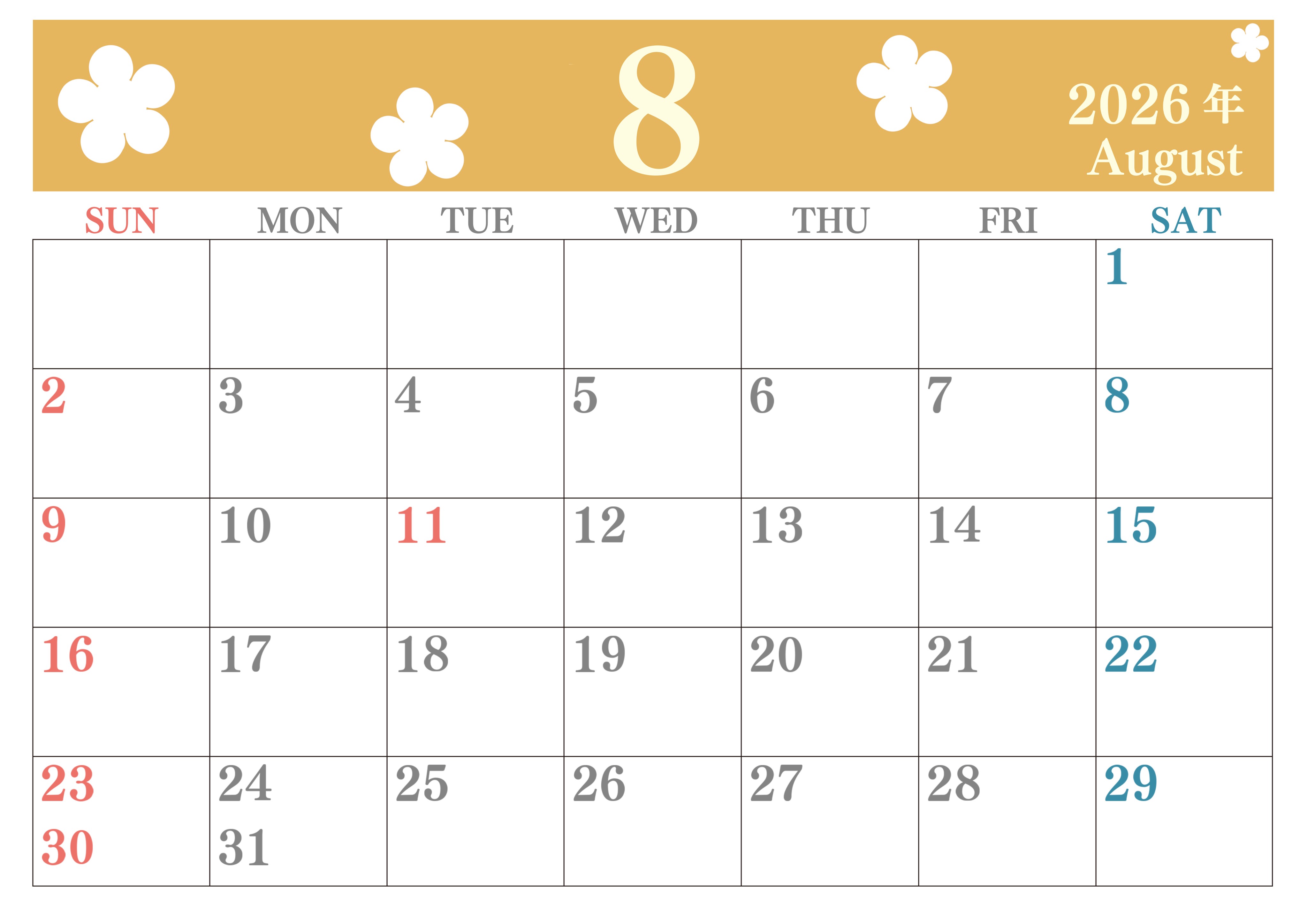 2026年・無料のカレンダーテンプレート 2026年8月カレンダーは横型日曜始まりでフラワーシルエットがかわいい♪ダウンロードは無料♪(2026-01320800) 素材状デザイン王 2025年4月10日 2026年8月カレンダーは横型日曜始まりでフラワーシルエットがかわいいです。花をテーマにしていて毎月カラフルなので暮らしにワクワクを添えられます。無料ダウンロードしましょう。(2026-01320800) かわいい 8月 草花 横型のカレンダー 日曜始まり カレンダーデザイン-0132