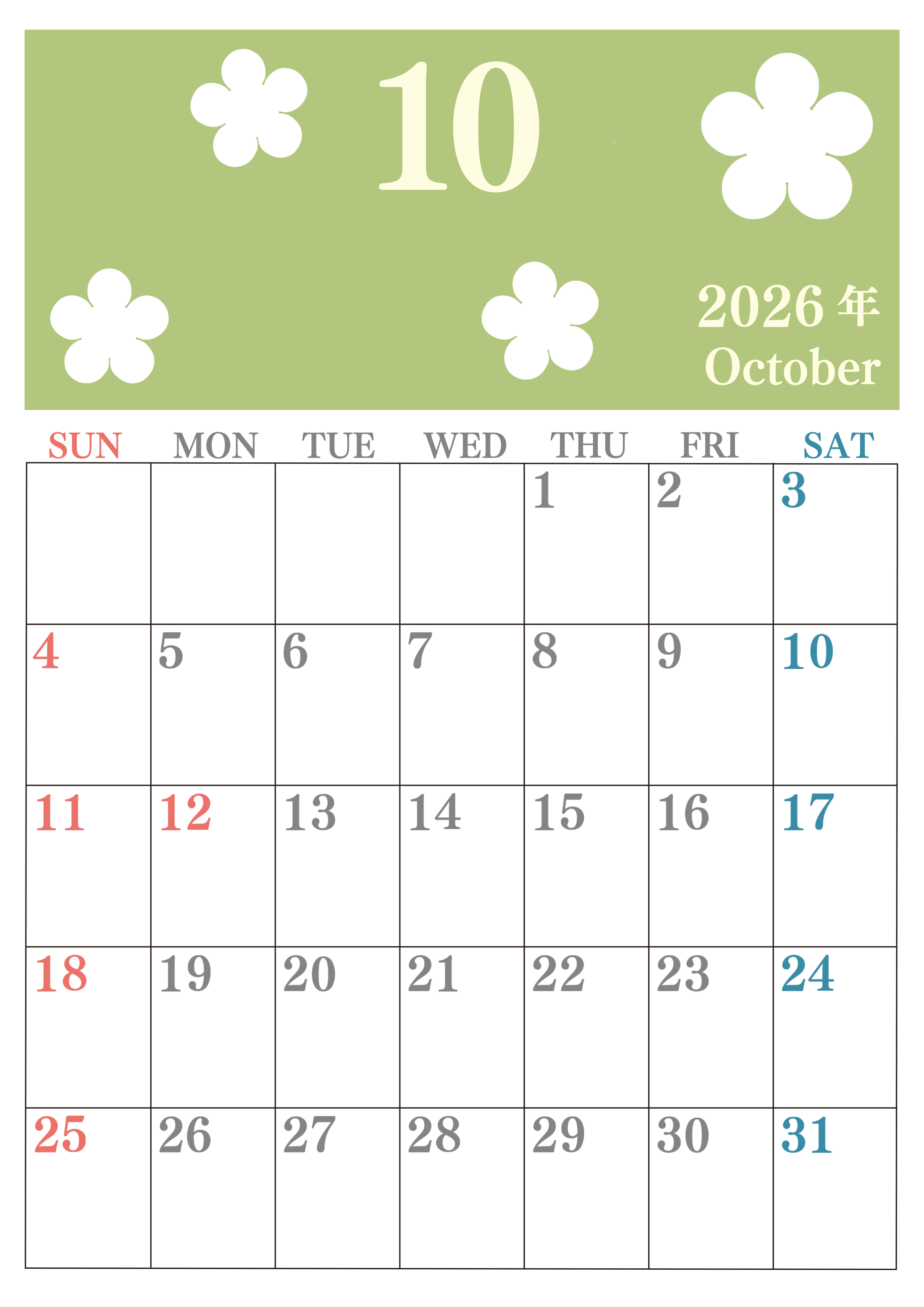 2026年・無料のカレンダーテンプレート 2026年10月カレンダーは縦型日曜始まりでフラワーシルエットがかわいい♪ダウンロードは無料♪(2026-01321010) 素材状デザイン王 2025年4月10日 2026年10月カレンダーは縦型日曜始まりでフラワーシルエットがかわいいです。花をテーマにしていて毎月カラフルなので暮らしにワクワクを添えられます。無料ダウンロードしましょう。(2026-01321010) かわいい 10月 草花 縦型のカレンダー 日曜始まり カレンダーデザイン-0132