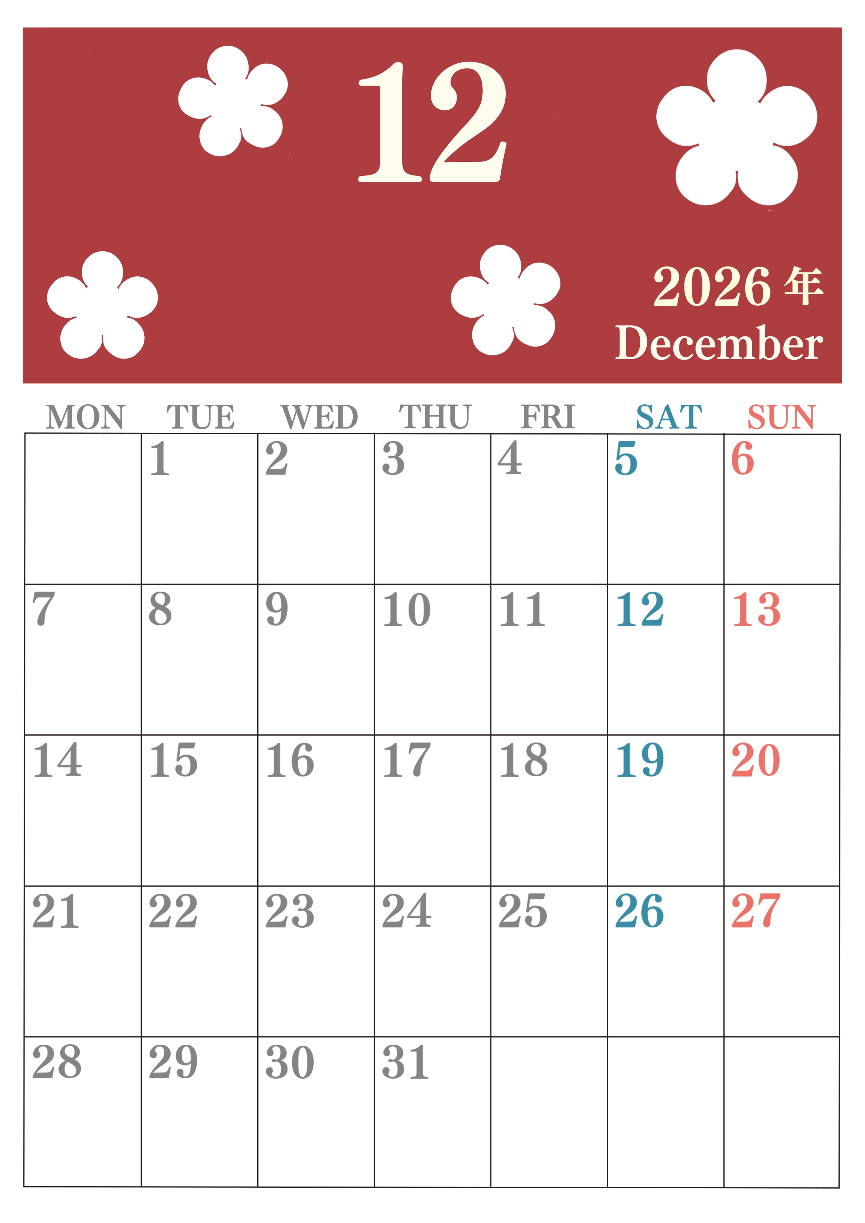 2026年12月カレンダーは縦型月曜始まりでフラワーシルエットがかわいいです。花をテーマにしていて毎月カラフルなので暮らしにワクワクを添えられます。無料ダウンロードしましょう。(2026-01321211)