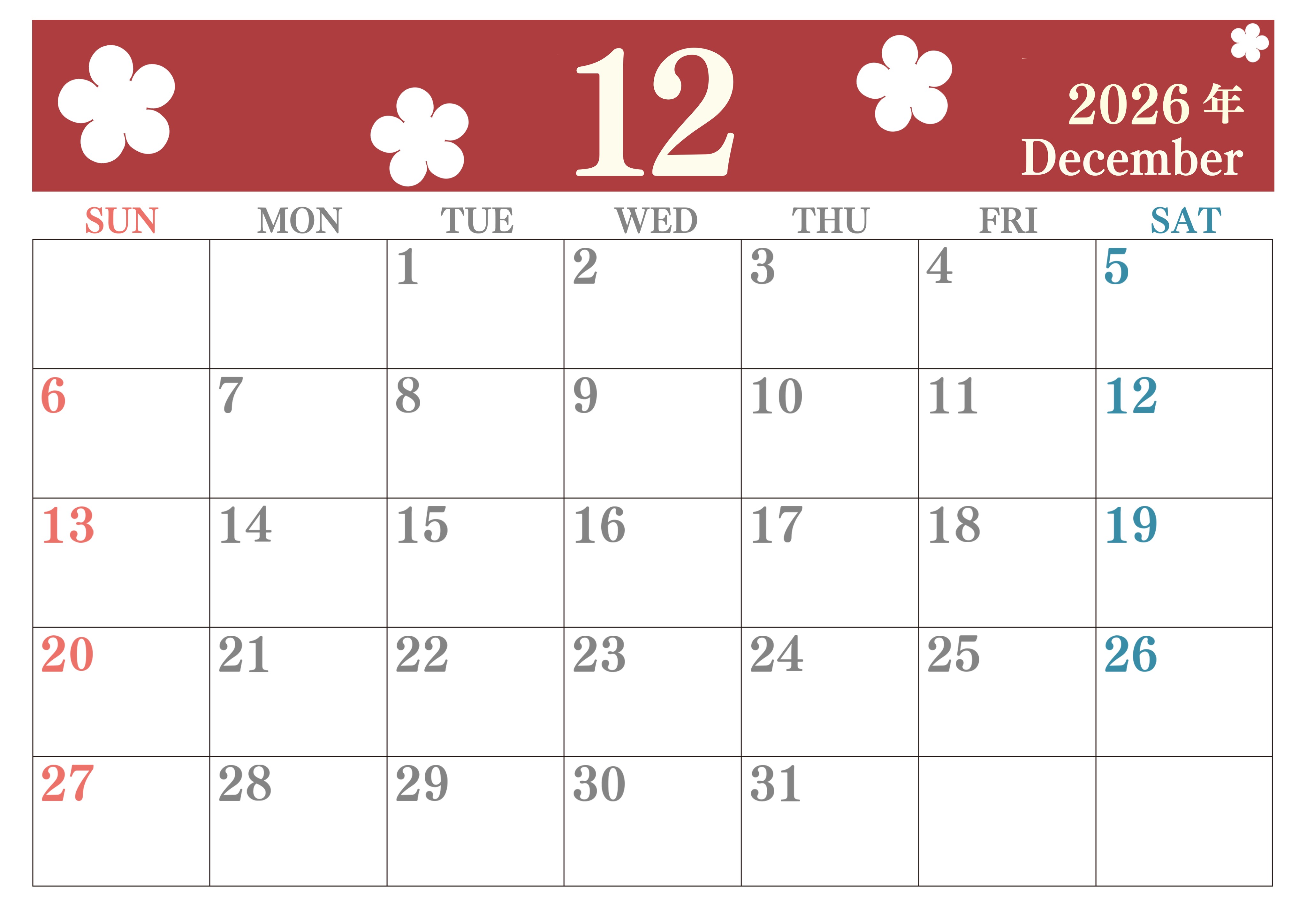 2026年12月カレンダーは横型日曜始まりでフラワーシルエットがかわいいです。花をテーマにしていて毎月カラフルなので暮らしにワクワクを添えられます。無料ダウンロードしましょう。(2026-01321200)