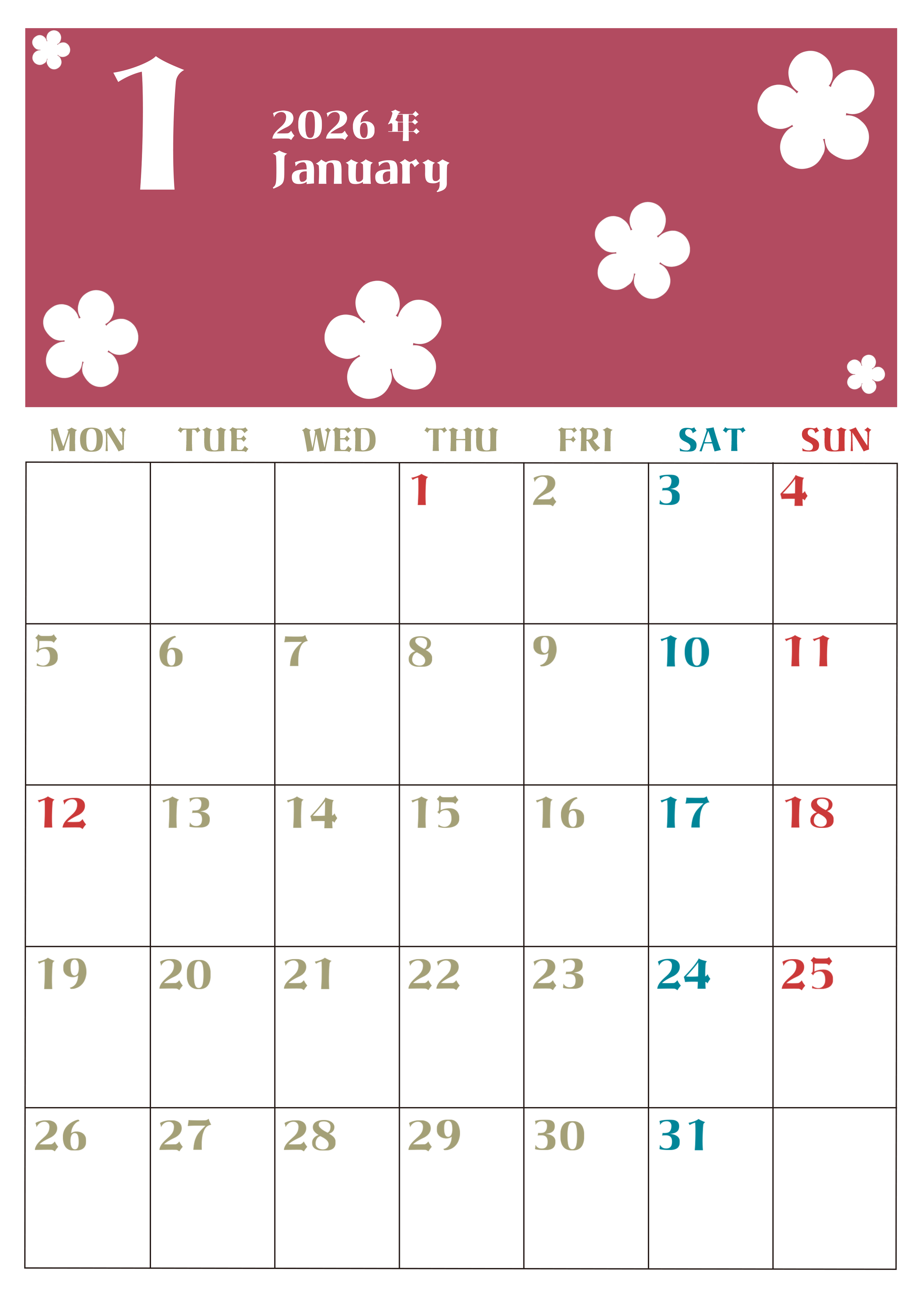 2026年・無料のカレンダーテンプレート 2026年1月カレンダーは縦型月曜始まりでフラワーシルエットが上品でおしゃれ(無料)(2026-01330111) 素材状デザイン王 2025年4月10日 2026年1月カレンダーは縦型月曜始まりでフラワーシルエットが上品でおしゃれなお花のデザインです。暮らしにほっこり休み時間を添えるプラン立てにおすすめの無料ダウンロード可能コンテンツです。(2026-01330111) おしゃれ 1月 草花 縦型のカレンダー 月曜始まり カレンダーデザイン-0133