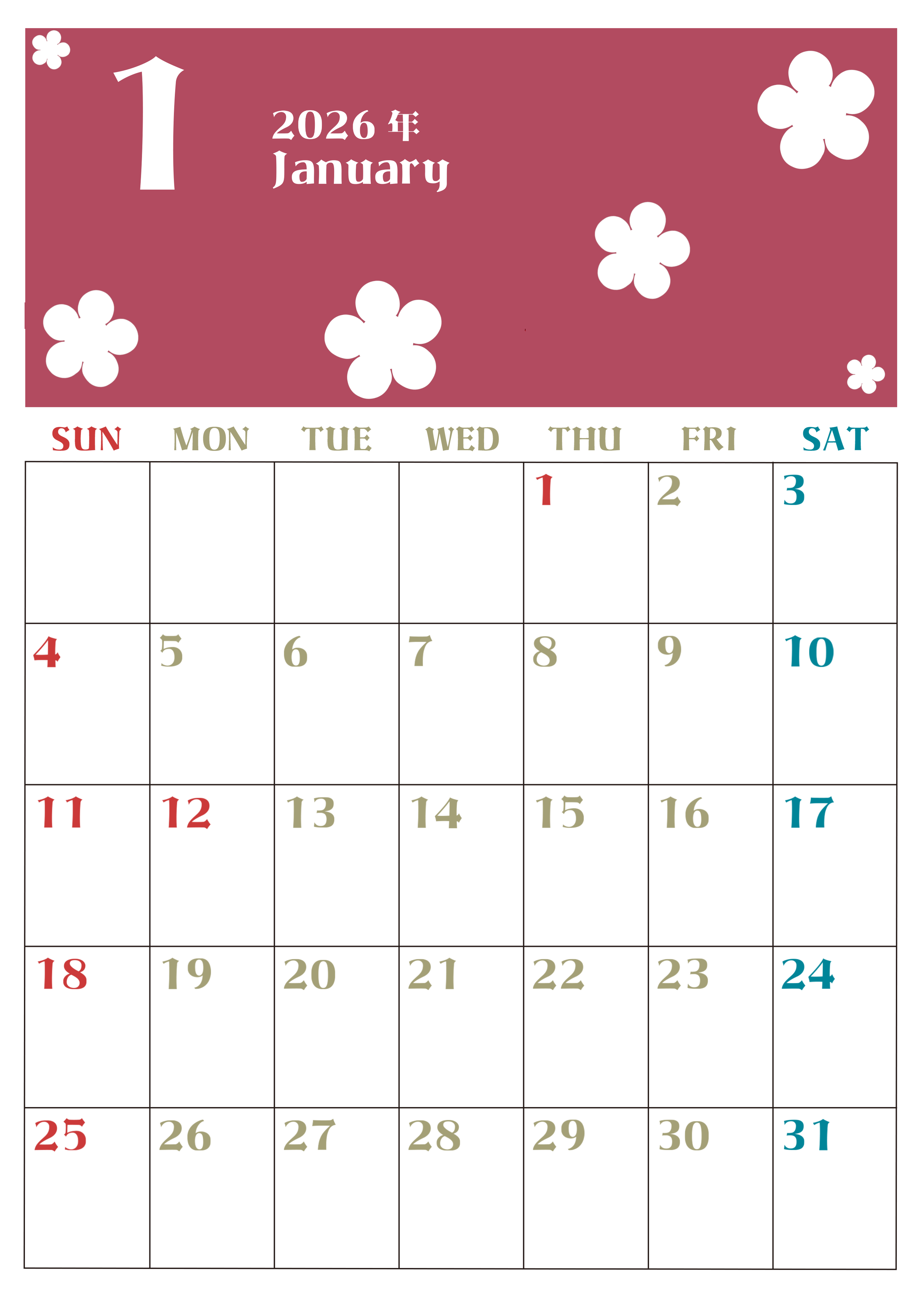 2026年・無料のカレンダーテンプレート 2026年1月カレンダーは縦型日曜始まりでフラワーシルエットが上品でおしゃれ(無料)(2026-01330110) 素材状デザイン王 2025年4月10日 2026年1月カレンダーは縦型日曜始まりでフラワーシルエットが上品でおしゃれなお花のデザインです。暮らしにほっこり休み時間を添えるプラン立てにおすすめの無料ダウンロード可能コンテンツです。(2026-01330110) おしゃれ 1月 草花 縦型のカレンダー 日曜始まり カレンダーデザイン-0133